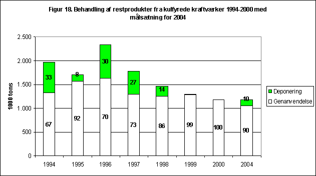 Figur 18 Behandling af restprodukter fra kulfyrede kraftværker 1994-2000 med