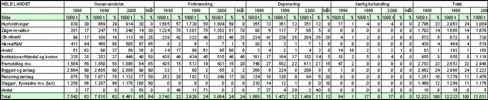 ![]() Kilde: ISAG indberetninger, Affald 21 Regeringens Affaldsplan 1998 2004, Danisco, Genvindingsindustrien og andre større skrothandlere, indberetning til Miljøstyrelsen om slam til udbringning på landbrugsjord m.v. og afbrænding af slam på slamforbrændingsanlæg (tal vedrører 1999). Affaldsmængden fra rensningsanlæg er inkl. sand og ristestof.