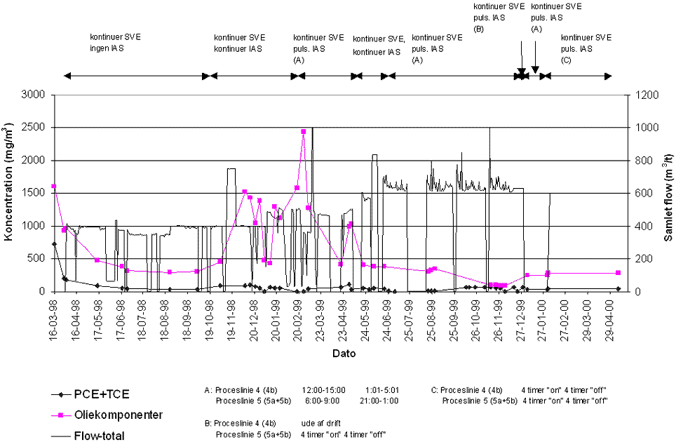 Koncentration og luftflow fra de i alt 5 SVE-filtre (16-03-1998 til 10-05-2000)