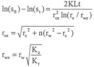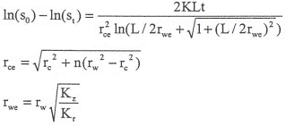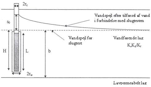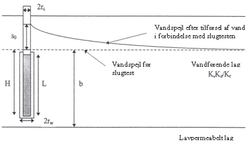 Kendes dybden af det vandførende lag kan der med fordel anvendes Bouwer & Rice metoden. 1.1.2 Bouwer & Rice metodenBouwer & Rice metoden bygger på et empirisk studie af sammenhængen mellem vandspejlets retablering i en boring efter der momentant enten er tilført eller fjernet vand fra boringen. Bouwer & Rice udledte i 1976 følgende udtryk : hvor :