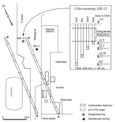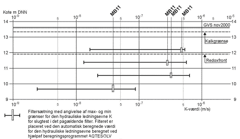 1.4 Udførelse at slugtestSlugtesten er udført i perioden 26. - 29. juli 2000. Slugtesten er udført i boring MB-11, der er filtersat i 4 niveauer. Placering og filtersætning af MB-11 fremgår af nedenstående figur C3.