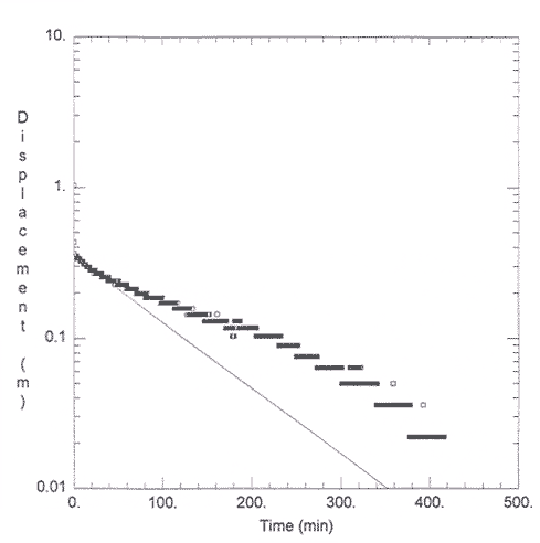 Figur C8, 1.6 Diskussion af resultater og følsomhedsanalyseUd over at variere valg af beregningsmetode (Hvorslev eller Bouwer & Rice) er der foretaget en følsomhedsanalyse ved at variere tykkelsen af den vandmættede zone, jf. afsnit 1.3. Derudover er der som nævnt i afsnit 1.2 benyttet den mulighed for at foretage en visuel/manuel kurvefitting til retableringskurven. Variationen af tykkelsen af den vandmættede zone mellem 0,3 og 1 meter har ikke givet anledning til en ændret hydraulisk ledningsevne K ved nogen af de udførte beregninger. Derimod ses en variation af den hydrauliske ledningsevne, afhængig af valg af metode. Generelt giver Bouwer & Rice metoden større K-værdier end Hvorslev metoden. Forskellen er ved at betragte resultaterne af de automatiske kurvefittings i tabel C2 op til omkring 20%. Ved at foretage en visuel/manuel kurvefitting kan der for mange af de udførte slugtest opnås en synlig afvigelse i K-værdien i forhold til den automatiske kurvefitting. Denne afvigelse kan aflæses som min og max-værdierne i tabel C2 angivet for det enkelte filter og beregningsmetode. Grunden til denne afvigelse skal formentlig søges i retableringsforløbet ved de pågældende slugtests. Da der er anvendt en lille gruskastning omkring filtrene kan den første del af kurveforløbet kaldet "early time" være påvirket af en "afsmitning" fra gruskastningen, så afsænkningen sker for hurtigt i forhold til hvad der ses i formationen. Man opnår da for store K-værdier i forhold til formationen. De mest repræsentative data vurderes derfor at være data i den sidste del af forløbet for afsænkningskurven også kaldet "late time data". Den pågældende problematik er afbildet i nedenstående figur C9, der viser et plot i AQTESOLV med angivelse af early og late time data.
