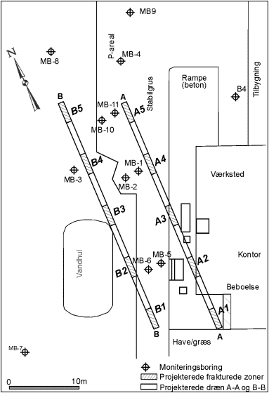 Omkring de 2 frakturerede dræn er der etableret i alt 11 nye moniteringsboringer,