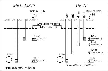 Boring MB-1 til MB-10 er filtersat separat i 2 niveauer, svarende til henholdsvis 1,0 m