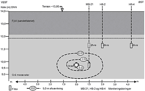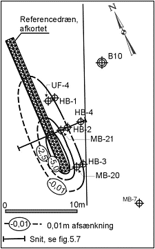 samme afstand og dybde fra drænet, ses ikke en tilsvarende kraftig sænkning. Da der ikke