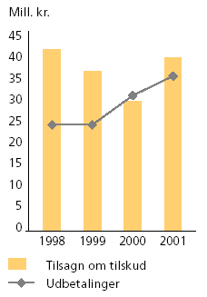 Ved administrationen af miljøstøtten bistås Miljøstyrelsen af Det Rådgivende Udvalg for Arktis, koordinationsudvalget for Arctic Monitoring and Assesment Program (AMAP) samt relevante myndigheder og organisationer. Der er i 2001 givet tilsagn om tilskud til 63 projekter for et samlet beløb på 41,0 mill. kr.(1) Der har været udbetalinger herunder til tidligere igangsatte aktiviteter - for 37,0 mill. kr. I de tilfælde, hvor det forbrugte beløb på et projekt er mindre end tilsagnsbeløbet, tilbageføres differencen til rammebevillingen og vil derfor kunne genbruges til en ny aktivitet. De samlede tilsagn om tilskud kan derfor afvige fra årets finanslovsbevilling. Finanslovsbevillingen for 2001 var på 40,6 mio. kr., hvortil kom en særskilt bevilling på 4,7 mio. kr. til særskilte miljøundersøgelser i Dundasområdet ved Thule Airbase. Midlerne til de særlige miljøundersøgelser ved Thule Airbase forventes overført til finansåret 2002 og udmøntet der. Det samme gælder støttetilsagn som ikke blev effektueret grundet udgiftsstoppet i december 2001. Tilskud til de enkelte delprogrammer i mio. kr.: