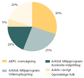 1 Tilsagn og udgifter. Indsatsen er opdelt i 4 delprogrammer: 1: AEPS/AMAP omfatter den danske del af det arktiske moniteringsprogram AMAP, som er et af 5 underprogrammer under den Arktiske miljøstrategi (AEPS), hvor der er etableret et samarbejde mellem de 8 arktiske lande. 2: Det Arktiske miljøprogram - videnopbygning støtter projekter, der bidrager med dokumentation og ny viden af betydning for løsning af miljøproblemer i arktiske samfund, især Grønland. 3: Det Arktiske Miljøprogram konkrete miljøtiltag omfatter aktiviteter, som sigter på at forbedre og bevare det lokale miljø og fremme miljøbevidstheden i den danske del af Arktis. 4: Støtte til oprindelige folk anvendes primært til at inddrage de fire oprindelige folks organisationer (Same Rådet, ICC, AIA og RAIPON) i det arktiske miljøsamarbejde. Under delprogrammet afholdes udgifter til drift af De oprindelige Folks Sekretariat i København. I 2000 og 2001 er støttet aktiviteter til hjælp for den oprindelige arktiske befolkning i Rusland. Støtten koncentrerer sig om institutionsopbygning og vidensudveksling blandt lokalbefolkningen i den arktiske del af Rusland. Hensigten er at hjælpe den arktiske oprindelige befolkning til tålelige miljøforhold og hjælpe dem til kontakt til den øvrige del af det arktiske miljøsamarbejde. Ca. 30 pct. af bevillingen er i 2001 anvendt til det arktiske moniteringsprogram AMAP, mens 45 pct. er anvendt til Det Arktiske Miljøprogram.(2) Ca. 20% er anvendt som støtte til de oprindelige folks organisationer og 5% til baseområder samt øvrige udgifter som trykkeudgifter, rejsestøtte m.m.