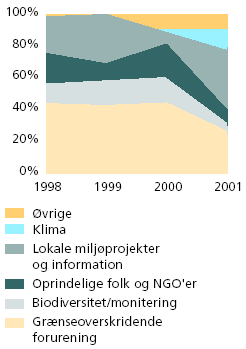 2 Tilsagn fordelt på delprogrammer. Den særlige støtte på 50 mio. kr. til et sektorprogram for miljø- og energimæssig renovering i Grønland er ikke medtaget i nærværende kapitel. Der er ikke sket væsentlige strategiske ændringer i prioriteringen af indsatsområderne i forhold til året før. Der har dog de sidste år været en tendens til øget støtte til løsning af konkrete miljøproblemer i den danske del af Arktis ligesom støtten til befolkningen i den arktiske del af Rusland er øget i takt med bestræbelserne for, at befolkningen kan få tålelige miljøforhold. Indsatsen omfatter et bredt spekter af områder.(3)