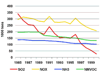 Siden 1980 har udslippene af de forsurende stoffer SO2 og NOX