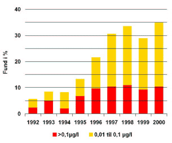 kemiske forureninger. I perioden 1990-2000 ligger de positive fund mellem 0,01% og 0,05%