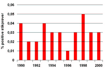 viser antallet af positive prøver i procent. Tallene fra 1999 og 2000 dækker kun over