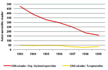 opløsningsmidler, er faldet konstant fra ca. 475 anmeldelser i 1993 til ca. 150