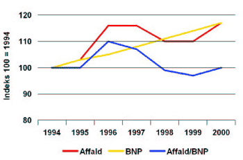 Samlet set er BNP og affaldsmængderne fuldstændig proprotionalt i perioden 1994 til
