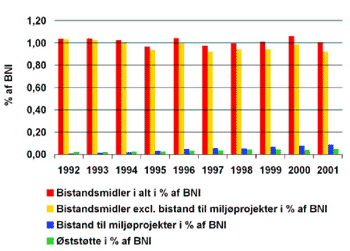 Miljøbistanden i 2001 udgjorde ca. 0,09% af BNI og har vist en stigning i årene