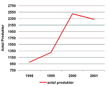 Der er fra 1998 til 2000 sket en støt stigning i antallet af miljømærkede produkter,