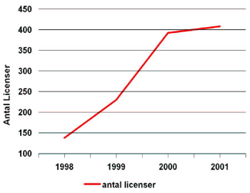 blev introduceret i 1998. Faldet i antallet af licenser fra 2000 til 2001 skyldes et fald