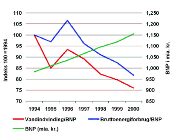 både energiforbruget og drikkevandsforbruget faldet frem til 2000. Der er i perioden sket
