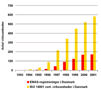 Siden 1994 er antallet af virksomheder med miljøledelse øget hvert år. En årsag til