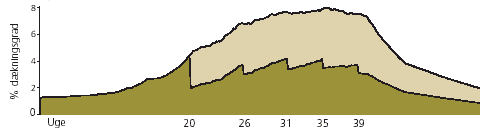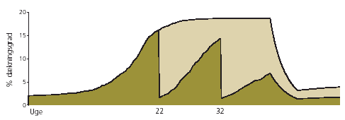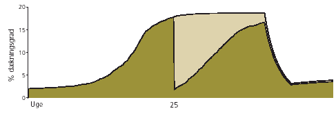 Effekt på ukrudtet Den mørkegrønne kurve viser, hvordan ukrudtet udvikler sig fra marts til oktober ved den valgte strategi. Takkerne markerer effekten af behandlingerne. Den lysegrønne kurve viser, hvordan ukrudtet ville have udviklet sig uden bekæmpelse. Forskellen mellem de to kurver er den effekt, man får af at gennemføre den foreslåede strategi. Strategierne skal betragtes som overordnede tommelfingerregler for bekæmpelsen. I nogle situationer vil de kræve lokale tilpasninger - se side 12-13.