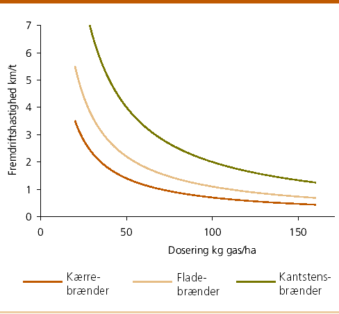 Når man øger fremdriftshastigheden, falder doseringen og omvendt. Sammenhængen er imidlertid ikke lineær. Det betyder, at en forøgelse af fremdriftshastigheden har størst effekt på doseringen ved lave hastigheder og høje doseringer. I praksis kræver enhver fordobling af doseringen, at fremdriftshastigheden halveres. Samtidig sker der en fordobling af behandlingstiden, hvilket er med til yderligere at øge effekten. Ydelse Det er vigtigt at kende sit redskabs ydelse. Den skal bruges som grundlag for at beregne den fremdriftshastighed, der svarer til den dosering, som er nødvendig for at sikre en tilstrækkelig effekt på ukrudtet. Det er vigtigt at kontrollere ydelsen, idet den i praksis ofte afviger fra det, fabrikanten eventuelt har oplyst. Redskabets ydelse kan kontrolleres ved hjælp af en ydelseskontrol. For gasbrændere kan det gøres ved at veje gasflaskerne før og efter kørsel i et kendt tidsrum på for eksempel en halv eller en hel time. For vandanlæg består ydelseskontrollen i at efterfylde tanken med brændselsolie, når redskabet har kørt i en afmålt tidsperiode.