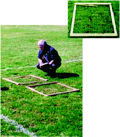 Mængden af græs, ukrudt og bar jord blev målt ved hjælp af en ramme på 75 x 75