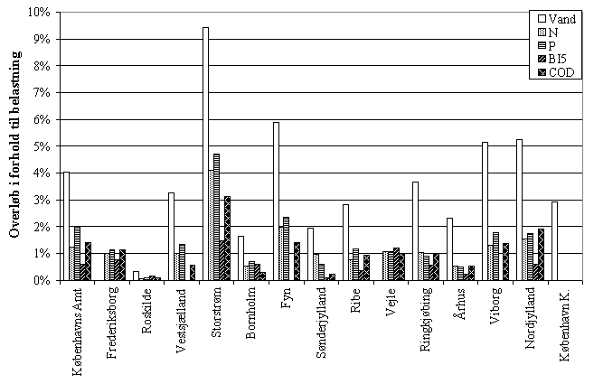 Figur 4.2 Overløbenes procentvise andel af den samlede belastning i oplandene til renseanlæggene > 5.000 PE, amtsvis fordeling.