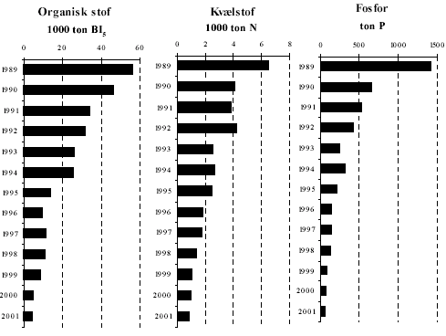 Som kvælstofudledningen blev fosforudledningen især kraftigt reduceret fra 1989 til 1990