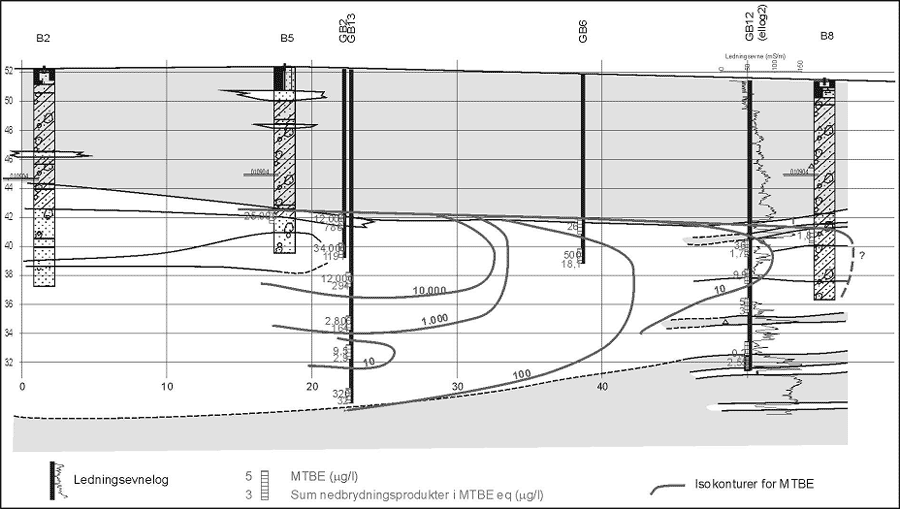 Figur 9.5 Vertikal MTBE-udbredelse i strømningsretningen (Profil 2b)