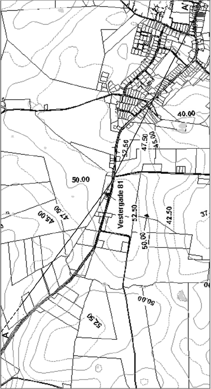 Figur 9.1 Topografisk oversigtskort. Placering af regionalt, geologisk profilsnit A-A'