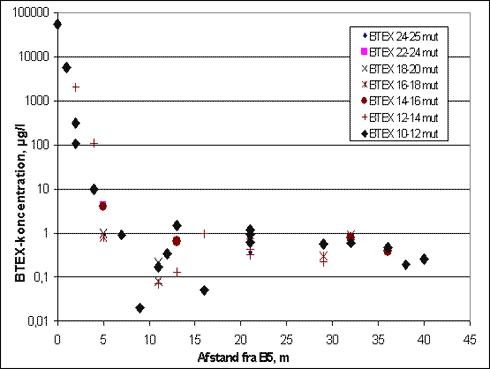 Figur 9.8 BTEX falder ligeledes markant umiddelbart nedstrøms kildeområdet og der ses en klar tendens til aftagende koncentrationer med stigende afstand til kildeområdet (B5), som illustreret på figur 9.8 (bemærk logaritmisk skala). Forudsætningen for, at den observerede koncentrationsreduktion er retvisende, kræver, at koncentrationen i de nedstrøms boringer repræsenterer grundvand fra kildeområdet. En stor nedadrettet stoftransport under kildeområdet, som der er indikation på, betyder at koncentrationerne nedstrøms ikke udtrykker den samlede forureningsmasse. Som nævnt i konklusionen efter fase 1 forventedes der på baggrund heraf en hovedsageligt horisontal forureningsspredning. Der er i modsætning hertil som det fremgår af de præsenterede data observeret en forureningsspredning, der også foregår vertikalt. Hvordan kan dette forklares ud fra forureningens alder og de observerede hydrogeologiske forhold? MTBE er anvendt i Danmark siden 1985, hvorfor dette er det tidligst mulige spildtidspunkt. Undersøgelsen er udført i 2001, hvilket giver en maksimal tid for forureningsspredning på 16 år. Den observerede spredning af MTBE og benzen i dybden kan sandsynliggøres ud fra de overslagsmæssige transporttider, beregnet i afsnit 9.3, idet den samlede transporttid fra terræn til bunden af det sekundære magasin er vurderet til 6-26 år. Det er således muligt at forklare den observerede forureningsspredning ud fra de lokale og regionale hydrogeologiske forhold. Kildestyrken fra moræneleret til det sekundære magasin vurderes overslagsmæssigt til at være 0,1-1 kg/år ud fra en udvaskning på 200 mm/år (vD), en kildestyrkekoncentration på 10-100 mg MTBE/l over et areal på 5m × 8 m. Er forureningen foregået over 16 år, fås en udvasket stofmængde på 1,6-16 kg. Overslagsberegningen er behæftet med væsentlig usikkerhed, idet kildeområdet i moræneleret ikke er afgrænset og forureningens alder er ukendt. Ses på de målte koncentrationer i det sekundære grundvand (figur 9.4 og 9.5) kan den samlede MTBE-masse i det sekundære grundvand beregnes til ca. 1,5 kg ud fra arealer og dybder af isokoncentrationslinier, som angivet på de to figurer. Den fundne masse i det sekundære grundvand svarer således til den nedre grænse for den udvaskede masse fra moræneleret. Derudover er noget af forureningen evt. allerede transporteret ned i det underliggende lag af moræneler. Hvor meget og over hvor lang tid vides ikke. Endelig er en del af MTBE-massen nedbrudt, men igen kan mængden ikke estimeres. Den videre flux mod det primære magasin kan beregnes ud fra 100 µg/l-isolinien, der når bunden af det sekundære grundvand. Med et areal på 25m × 13 m, en koncentration på 100 µg/l og en Darcy-hastighed på 0,75 m/år (se beregning i afsnit 9.2) fås en flux fra det sekundære mod det primære magasin på 24 g MTBE/år. Figur 9.9 Som nævnt er samtlige 60 vandprøver screenet i felten for MTBE og BTEX vha. felt-GC og heraf er 27 prøver udvalgt til laboratorieanalyse for samtlige forureningskomponenter, nedbrydningsprodukter og vandkemiske parametre. Der var god overensstemmelse mellem felt-GC-analyserne og Purge&Trap-analyserne for MTBE, se figur 9.9. Detektionsgrænsen for MTBE på felt-GC er ca. 5-10 µg/l mod 0,1-1 µg/l for Purge&Trap-metoden. Felt-GC'en medtager BTEX, men ikke nedbrydningsprodukter for MTBE. Felt-GC-analyser er attraktive økonomisk og tidsmæssigt, idet prøven analyseres direkte i felten og resultatet derfor modtages med det samme. Således vurderes felt-GC'en at være velegnet til analyse for MTBE alene eller som basis for udvælgelse af prøver, der skal analyseres for nedbrydningsprodukter. Koblingen mellem de to analysemetoder giver mulighed for en hurtig respons og dermed en kontinuert målretning af vandprøveudtagningen i felten. 9.5 NedbrydningVandprøverne er som nævnt analyseret for følgende nedbrydningsprodukter af MTBE; TBA, TBF, isopropanol og acetone. Der er konstateret indhold af alle 4 nedbrydningsprodukter i koncentrationer på op til 1000 µg TBA/l, 66 µg TBF/l, 660 µg acetone/l og 9,6 µg isopropanol/l. De højeste koncentrationer er konstateret i kildeområdet (B5, GB1 og GB2). På profilerne i figur 9.5 og 9.6 er nedbrydningsprodukterne afbildet som sum af MTBE-ækvivalenter, dvs. omregnet vha. molvægten for hhv. nedbrydningsproduktet og MTBE, således at stofferne er umiddelbart adderbare. MTBE og nedbrydningsprodukter er endvidere afbildet på planskitser i bilag 10. Det ses, at den relative andel af nedbrydningsprodukter er højest, hvor MTBE-koncentrationerne er lave. Endvidere ses det, at de højeste koncentrationer forekommer tæt ved kildeområdet i toppen af magasinet og aftager med afstanden herfra såvel som med dybden. I samtlige Purge&Trap-analyserede vandprøver forekommer der indhold af nedbrydningsprodukter (særligt TBA og TBF) svarende til 1-10 % af det totale indhold af MTBE og nedbrydningsprodukter. Stedvist (hvor koncentrationsniveauet er lavt) er denne procentdel oppe på 50-80 %. De observerede indhold af TBA, TBF, isopropanol og acetone indikerer, at der foregår en omsætning af MTBE i det sekundære grundvandsmagasin. Udregnes andelen af nedbrydningsprodukter i forhold til det maksimalt målte MTBE-indhold er procentdelen væsentligt mindre; 0,003 - 3,5%. Således fremgår det, at den observerede reduktion af MTBE ikke modsvares af et tilsvarende indhold af nedbrydningsprodukter. Da MTBE i sidste ende nedbrydes til kuldioxid og vand, kan der ikke forventes massebevarelse for summen af MTBE og nedbrydningsprodukter. Den observerede sum af nedbrydningsprodukter (TBA, TBF, acetone og isopropanol) er dog i det aktuelle tilfælde væsentligt lavere end det observerede koncentrationsfald i moderproduktet (MTBE). 9.6 GeokemiIndholdet af geokemiske parametre i de filtersatte boringer i toppen af magasinet er afbildet i bilag 7. Øvrige geokemiske analyser fremgår af bilag 6B. Koncentrationsfordelinge