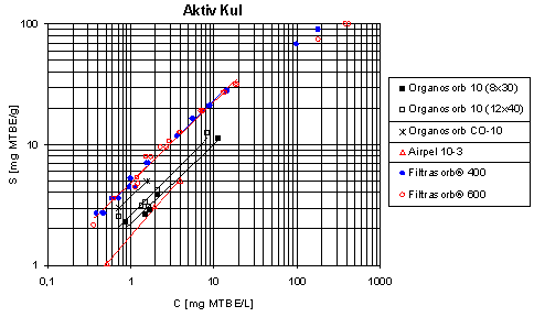 4,8 og 22,6 mg/g ved hhv. 1 og 10 mg MTBE/L (beregnet fra Freundlich-isotermen fittet til