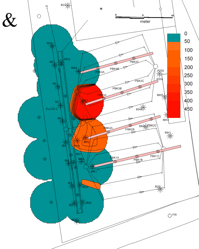 baggrund af kemiske analyser af indholdet af TCE i grundvandet. Maksimumværdier 300-450