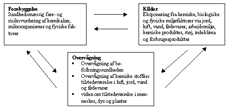 Figur 3. Ansvaret for reguleringen er fordelt mellem de forskellige ministerier, hvor Indenrigs- og Sundhedsministeriet for eksempel har ansvaret for overvågning af befolkningens sundhedstilstand generelt, mens de øvrige ministeriers ressort i højere grad knytter sig til den forebyggende indsats og til at begrænse kilderne til sundhedspåvirkning. Indenrigs- og Sundhedsministeriet er den overordnede sundhedsmyndighed og har derfor ansvaret for de overordnede sundhedspolitiske strategier og den generelle udvikling inden for sundhedssektoren. Sundhedsstyrelsen varetager blandt andet overvågningen af befolkningens generelle sundhedstilstand. Sundhedsstyrelsens opgaver i forbindelse med miljøfaktorer ligger i det nyoprettede Center for Forebyggelse. Centret skal ud over livsstilsfaktorer varetage forebyggelsesopgaver i forbindelse med sygdomme som for eksempel astma og allergi, hudkræft, muskel- og skeletsygdomme. Centret skal varetage rådgivningsopgaver mv. på det miljømedicinske område og samarbejde med relevante ministerier. De konkrete indsatser over for kilder hører under de relevante ressortministerier. Opgaverne i forbindelse med miljøfaktorer omfatter samarbejde med og rådgivning af andre ministerier (for eksempel Miljøministeriet), embedslægerne og forskningsinstitutioner. Omfanget af Sundhedsstyrelsens samarbejde i forbindelse med Miljøministeriets institutioner har været og er afhængig af de ressourcer, som på det miljømedicinske område tildeles Sundhedsstyrelsen. Embedslægernes rolle er overordnet set at overvåge sundhedstilstanden på amtsligt niveau og dermed også sundhedsaspekter, der stammer fra miljøfaktorer. Embedslægerne er ansat i Indenrigs- og Sundhedsministeriet og virker lokalt. Embedslægerne rådgiver både staten, amter og kommuner. Koordinering og udveksling af viden om miljø- og sundhedsproblemer sker gennem kontakt til og samarbejde med Sundhedsstyrelsen og Miljøstyrelsen. Seruminstituttet varetager overvågning og rådgivning vedrørende smitsomme sygdomme i samarbejde med blandt andet Sundhedsstyrelsen. Statens Institut for Strålehygiejne varetager opgaver af strålebeskyttelsesmæssig karakter inden for områder, hvor der anvendes ioniserende stråling, særligt i forbindelse med brugen af røntgenanlæg og radioaktive stoffer. Hovedopgaven er at sikre arbejdstagere, patienter og befolkningen som helhed samt dyr og miljø mod skader fra ioniserende stråling Miljøministeriet er ansvarlig for miljøbeskyttelse, herunder sundhedsaspekter der kan opstå på grund af forurening af miljøet. Ministeriet har dermed ansvaret for at forebygge risici for befolkningen som følge af påvirkninger fra det ydre miljø. Aktiviteterne omfatter forebyggende aspekter som at fastsætte regler for udledning af kemiske stoffer og mikroorganismer til luft, jord og vand samt at fastsætte kvalitetskriterier for luft, jord og vand. Herudover fastsætter ministeriet niveauet for støj fra handel, industri og trafik. Ministeriet fastsætter også regler om vurdering og anvendelsesbegrænsning af kemikalier samt vurdering og krav til mikroorganismer. Ministeriet har ansvaret for at begrænse de kilder fra det eksterne miljø, som kan skade miljø og sundhed. Ministeriet har endvidere ansvaret for direkte sundhedseffekter fra kemikalier i forbrugerprodukter herunder kosmetik og legetøj. Under ministeriet hører tre uafhængige forskningsinstitutioner, hvor Danmarks Miljøundersøgelser og Danmarks og Grønlands Geologiske Undersøgelser har kompetence inden for monitering og opbygning af viden om miljøfaktorer. Forskningscenteret for Skov og Landskab har kompetence inden for skov, landskab, det åbne land og byer. Ministeriet omfatter tre administrative styrelser, hvor Miljøstyrelsen er ansvarlig for reguleringen af hovedparten af miljøfaktorerne. Miljøstyrelsen har på det sundhedsmæssige, det toksikologiske og det mikrobiologiske område et tæt samarbejde med Fødevaredirektoratet, Danmarks Veterinærinstitut, Zoonosecenteret under Fødevareministeriet, Sundhedsstyrelsen og Statens Serum Institut. Fødevareministeriet er overordnet ansvarlig for fødevarelovgivningen. Under ministeriet hører Fødevaredirektoratet, som fastsætter konkrete regler og krav til fødevarernes sammensætning og sikkerhed samt til virksomhedernes indretning og behandling af fødevarer. Fødevarevirksomhederne har ansvaret for, at de fødevarer, der produceres og afsættes til forbrugerne, er sikre. Fødevaredirektoratet kontrollerer, om virksomhederne overholder reglerne. I Fødevaredirektoratet ligger Institut for Fødevaresikkerhed og Ernæring. Instituttet varetager forsknings-, udviklings- og overvågningsopgaver for Fødevaredirektoratet og for Miljøstyrelsen. Under Fødevareministeriet hører endvidere Danmarks Veterinærinstitut og Zoonosecentret, som står for forskning og overvågning i forhold til bakterier og vira mv. Under Beskæftigelsesministeriet hører Arbejdstilsynet, som er den danske myndighed på arbejdsmiljøområdet. Arbejdstilsynet er ansvarlig for at fastsætte krav til de miljøfaktorer, der vedrører arbejdstagernes sikkerhed og sundhed fra fysiske, kemiske og mikrobiologiske påvirkninger i arbejdsmiljøet. Det gælder for eksempel fastsættelse af grænseværdier for arbejdet med farlige kemikalier på arbejdspladsen, regler om arbejdsstedets indretning og fastsættelse af normer og standarder inden for byggeri. Arbejdstilsynet fører tilsyn med, at reglerne om håndtering af kemikalier på arbejdspladsen overholdes. Arbejdstilsynet deler Produktregistret med Miljøstyrelsen og har ansvaret for risikovurdering af kemikalier i arbejdsmiljøet. Arbejdsmiljøinstituttet (AMI) er et selvstændigt sektorforskningsinstitut under Beskæftigelsesministeriet. AMI skal medvirke til at skabe et sikkert, sundt og udviklende arbejdsmiljø gennem klarlægning og udforskning af forhold i arbejdsmiljøet, som har betydning for arbejdstagernes sikkerhed og s