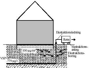 Ekstraktionsboringen/-erne filtersættes med filtertop min. 1,5 m u.t, dog gerne dybere. Risikoen for lækage minimeres med dybden til det øverste luftindtag. (filtertop). Samtidig skal der dog foretages en nøje vurdering af om en vakuumekstraktion i en given dybde forventes at have den ønskede effekt i niveauet umiddelbart under gulvene. Boringerne afproppes ved terræn så risiko for lækage langs borehullet/filteret elimineres. Rørføringen mellem vognen og boringen etableres ved montering af en overjordisk fleksibel rørføring. Vognen parkeres typisk direkte over den enkelte boring eller i kort afstand derfra, hvorved den overjordiske rørføring bliver kort og med minimal gene for de daglige aktiviteter i området. Fastgørelse/ overdækning af rørføringen er derved oftest unødvendig. Der etableres af hensyn til risiko for chikane mulighed for at fastlåse ekstraktionsanlægget med en kæde og hængelås til et fast øsken monteret under terræn i den enkelte boringsafslutning. Flere boringer kan være tilsluttet samtidigt. Dette gøres på en fælles manifold, der typisk placeres udenfor ekstraktionsanlægget. Manifolden monteres i så fald reguleringsventiler, således at der kan foretages en indregulering imellem de enkelte boringer. Endvidere monteres der prøvetagningshaner for kontrol af forureningsindhold og modtryksforhold i ventilationsområdet. Der kan forventes en levetid for ekstraktionsanlægget på ca. 10 år. Effekt: Anlægget har effekt umiddelbart efter opstart. Ekstraktionen etableres typisk som en periodisk ekstraktion over eksempelvis 14 dages perioder eller evt. op til 1 måneds ekstraktion. I ekstraktionsperioderne bortventileres i størrelsesordenen 30-100 m3/h, svarende til en luftudskiftning på 150-500 luftudskiftninger i influensområdet pr. måned. Ved en gennemsnitlig koncentration på f.eks. 5 mg PCE/m3 fjernes der derved ca. 200 g PCE/mdr. Da ekstraktionen pågår periodisk, vil der ske et tilbageslag i forureningskoncentrationen i den umættede zone. Ved monitering og driftsovervågning er det derfor vigtigt at ekstraktionsperioderne tilrettelægges med en sådan frekvens at tilbageslaget ikke når at give anledning til problematiske indeklimapåvirkninger i perioderne uden ekstraktion. Der kan opnås reduktioner i indeklimapåvirkningen på op til 80 %. Ekstraktionen har primært effekt overfor indeklimapåvirkninger. Er der alene tale om en terrænnær forurening til gene for indeklimaet, kan der eksempelvis opnås en oprensning indenfor 1-3 år. Er der derimod tale om en samtidig problematisk grundvandspåvirkning vil det, for at undgå at foranstaltningen bliver varig, være nødvendigt at iværksættes særskilte tiltag overfor denne. Miljøprofil: Negativ effekt: Et årligt elforbrug på ca. 13.000 kWh (derved et ressourceforbrug af eksempelvis kul og en miljøbelastning ved udledning af forbrændingsgasser i forbindelse med elproduktion). Arbejdsmiljømæssige gener ved håndtering af brugt kul (kulfilter). Trods støjdæmpning skal påregnes et støjniveau fra ekstraktionsanlægget på 35-50 dB(A) (påklages sjældent). Pladskrav for anlægget er ca. 10 m2 samt tilkørselsmulighed i forbindelse med opstilling. Metoden kræver, at der foretages en byggeteknisk gennemgang, da der kan opstå råd og lign. i trækonstruktioner (under gulve) som følge af ventilation. Positiv effekt: Indeklimaet forbedres forureningsmæssigt mens oprensning pågår, hvorved foranstaltningen kun vil være nødvendig i en afgrænset tidshorisont. Ekstraktionsanlægget kan nemt genanvendes ved efterfølgende afværgeprojekter. I pauseperioder for ekstraktionen kan anlægget ligeledes sideløbende anvendes på andre forurenede lokaliteter. Ved indbygning i trailer foretages flytning nemt ved anvendes af almindeligt køretøj med træk. Trailerkørekort er ikke påkrævet. Etablering: Ekstraktionsanlægget leveres færdig på pladsen. Ekstraktionsboringer etableres ved tradition maskinel boreteknik. De pneumatiske forhold testes i hvert enkelt boring inden endelig etablering af boringsafslutninger mv. Boringer med afvigende ringe ydelse kasseres og erstattes efter behov. Ventilationstest (kontrol af flow og modtryksforhold) danner endvidere grundlag for dimensionering af pumpe og flowmåler. Den overjordiske rørføring har en minimal udbredelse og fastgørelse vil sjældent være en nødvendighed. Ved metoden er der ingen indvendige installationer i bygningen. Etableringsfasen er kort. Den største gene beboerne i anlægsfasen vil bestå i selve borearbejdet og ved etablering af boringsafslutninger. Arbejdet på den enkelte lokalitet kan dog oftest afsluttes i løbet af ca. 2 arbejdsdage. Erfaren entreprenør anbefales. Det samlede arbejde kan afsluttes i løbet af 1-3 uger. Drift: Indkøring. Indjustering af ydelser i de enkelte ekstraktionsboringer udføres ved opstart. Grundlag er ventilationstests og eksempelvis PID eller feltGC målinger. Drift. De efterfølgende justeringer vil primært være baseret på baggrund af PID og evt. felt GC målinger (evt. hver 2-6 md.) og vil oftest være minimale i omfang da der kun etableres 1-3 boringer pr. lokalitet. Der føres sjældent særskilt driftstekniks tilsyn, da tilsyn føres samtidig med start og stop af ekstraktionen. Komponenterne i ekstraktionsanlægget er oftest vedligeholdelsesfrie. Der kan dog være tale om smørring af pumpe og udskiftning af luftfilter. Hvis ekstraktionsanlægget alene er i drift i den/de samme ekstraktionsboringer under hele forløbet, kan start og stop af pumpen kan udføres uden besigtigelse men blot ved fjernbetjening (opkald til operatørpanel). Ved anvendelse af 20 kg aktiv kul i opstartsfasen kan typisk påregnes 1-5 tømninger pr. år afhængig af de aktuelle forureningsmæssige forhold. Monitering: Indkøring. Programmet kan minimeres til en indledende dokumentation og begrænset efterfølgende kontrol og tilpasning . Der udføres eksempelvis en dokumentation ved indeklimamåli