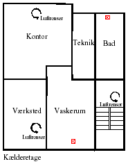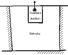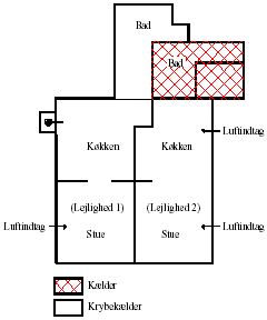 DB-4: Ventilation af kælderetageFunktion: Ved at etablere en øget ventilation i kælderetagen bortventileres forurenet indeluft, hvorved indeklimapåvirkningen i kælderen og de øvrige etager reduceres (fortynding). Den øgede ventilation skaber samtidig et let undertryk i kælderetagen, hvorved der etableres en luftstrømning fra den øvrige bolig mod kælderen (spredning hindres). Strømningsretning og influenszoner, for den ventilerende luft, styres ved at kombinere "udsugning" med "luftindtag". I flere lokaler i kælderetagen etableres en kunstig lækage (luftindtag) med forbindelse til udvendigt terræn. Uden luftindtag vil lufttilførslen ske gennem tilfældige revner i fundamentet samt gennem revner og utætheder i gulvkonstruktionen. Antallet af udsugningspunkter svarer omtrent til antallet af luftindtag. Antallet af udsugningspunkter afhænger af forureningsgraden, de byggetekniske forhold og det nødvendige luftskifte i kælderen. Der skal påregnes et luftskifte på min. 1 gang pr. time. Metoden anvendes som en permanent afværge (kontinuert drift) overfor ejendomme, der er påvirket i moderat grad og uden udeluftspåvirkning. Ved metoden foregår der ingen oprensning af forureningskilden. Anlægsbeskrivelse: Udsugningspunkter påmonteres el-ventilatorer og etableres eksempelvis i kældervinduer eller ved gennemboring af overjordisk fundament. Støjgener kan minimeres ved at placere ventilatoren i et eventuelt loftrum i ejendommen. Ved en sådan montage er det nødvendigt at etablere en rørføring fra kælder til loftsrum, hvorved anlægsudgiften øges markant. Ved montage af ventilator i loftsrum eller lign. er det vigtigt at montagen sker med diffusionstætte samlinger, og at den valgte ventilator er tæt. I modsat fald kan der ske en opkoncentrering af forureningsdampe i loftsrummet og en evt. efterfølgende forureningsspredning til de beboede lokaler. Det skal endvidere bemærkes, at anvendelsen i kælderen sjældent fordrer særlige støjmæssige foranstaltninger. Ventilatorerne monteres med omdrejningsregulator (potentiometer, regulering af flow) og timetæller (registrering af driftstimer). Timetæller og potentiometer indbygges fx i en samlet styreboks, der monteres på væggen nær de enkelte udsugningspunkter (evt. aflåselig). For at undgå indsugning af luft med høj luftfugtighed kan evt. indbygges fugt- eller temperaturstyring (eksempelvis ingen indsugning ved udetemperatur over 18 °C. På ejendommens eltavle indbygges evt. en selvstændig gruppe til forsyning af el-ventilatorerne. Alternativt installeres elventilatorerne med forsyning fra eksisterende stikkontakter. Førstnævnte alternativ vil resultere i en merudgift på ca. 1.000 kr. Udsugningspunkter etableres med direkte forbindelse til udvendigt terræn og placeres så der sker en hensigtsmæssig bortledning og en naturlig fortynding af den bortventilerede forurenede luft. Ved placeringen tages der hensyn til eventuelle naboer og vinduer på overliggende etager, da der ellers kan ske indsugning af forurenet afkastluft. Som supplerende drivkraft kan det i nogle tilfælde udnyttes, at der på en af bygningens to modstående sider kan opstå relativt store trykforskelle (luv/læ). Det opståede differenstryk anvendes i såfald som supplerende drivkraft. Luftindtag etableres ved montage af rist i kældervinduer eller ved gennemboring af fundament. Luftindtag og udsugningspunkter placeres så risiko for kortslutning mellem to punkter minimeres, og således at der ikke opstår uventilerede zoner. Metoden med rumventilation er en velafprøvet teknik også i andre sammenhænge (fx ved ventilation af vådrum). Effekt: Afværgen har effekt efter en ganske kort indkøringsperiode. En forurening under bygningen vil bevirke, at der sker en kontinuert frigivelse af forureningskomponenter og en ophobning i perioder uden ventilation. Ventilatoren dimensioneres efter, at der sker en løbende bortledning, hvorfor tiltaget først har fuld effekt efter, at der opnåes ligevægt mellem fjernelsen og tilførslen af forureningskomponenter (typisk efter ca. 3 døgns drift, svarende til 75-150 luftudskiftninger i kælderetagen). En el-ventilator ventilerer typisk 100 m3/t (afhængig af model og regulering). Ved etablering af to ventilatorer i en kælderetage på ca. 60 m2 og med en loftshøjde på ca. 2 meter opnås derved et luftskifte i kælderetagen ca. 15.000 gange pr. år. Ved en gennemsnitlig PCE koncentration på f.eks. 25 µg/m3 fjernes således ca. 45 g PCE/år.
