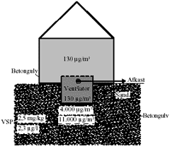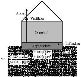 DB-8.1: Ventilation af krybekælder (aktiv)Margårdsvej 26, Nørre Aaby, Fyns AmtForureningsscenarium: I bygningen har der i perioden 1968 til 1978 været drevet renseri. Herefter har ejendommen, indtil januar 2002, været opdelt i mindre lejligheder til udlejning. Ejendom er nedrevet i januar 2002 og der er efterfølgende foretaget en bortgravning af forurenet jord. Der er påvist en kraftig forurening med chlorerede opløsningsmidler, primært PCE, jf. nedenstående figur 2 og tabel 1. Indeklimapåvirkningen vurderes primært at stamme fra bidrag under bygningen. Bidrag fra sinks er dog ikke undersøgt særskilt og kan være væsentlige. Der er ikke foretaget nogen bortgravning af forurenet jord i perioden før bygningen nedrives. Jordbundsforholdene består af moræneler under et mindre sandlag. Vandspejlet står ca. 1 m u.t. Formål: Midlertidig aktiv ventilation af krybekælder med henblik på at reducere den massive indeklimapåvirkning indtil ejendommen nedrives. Bygning: Ældre murstensvilla indrettet med mindre lejligheder, hvor lejlighed 1 og 2 er placeret i de tidligere renserilokaler. Under de to lejligheder er krybekælder (ca. 85 m2) samt en mindre kælder (13 m2). Der foreligger ingen oplysninger om, hvordan krybekælderen er opdelt (fundamentafsnit). Etageadskillelsen mellem krybekælder/kælder og stueetage er udført som trægulve. Afværge: Aktiv ventilation af krybekælder med indsugningsriste. Det er forudsat at krybekælderen under huset er sammenhængende og at der ved ventilation (sug) alene i ét punkt sikres en tilstrækkelig luftudskiftning under hele huset. Der er suget fra ét punkt med Lindab kanalventilator (IRE 125 B) med en kapacitet på 300 m3/t, hvilket bevirker at der sker en luftudskiftning på ca. 50.000 gange pr. år i krybekælderen (krybekælders højde er forudsat at være ½ m). Der er etableret luftindtag i 3 særskilte ventilationsriste, ligeledes placeret i krybekælderen. Der er ingen reguleringsmulighed på ventilatoren. Ventilatoren er placeret udvendig i en lyddæmpet boks. Afkastluften er ført til udledning over tag via et Ø125 mm udvendigt ventilationsrør (stål- eller spirorør). Det er ikke vurderet nødvendigt med permanent rensning af afkastluften (kulfiltrering) Dokumentation: Primær dokumentation. Indeklimamålinger (IK) er udført i stueplan ved passiv opsamling på ADT-rør. Ved målingen dokumenteres det at værgen har direkte effekt på indeklimaet Øvrig dokumentation. Ingen Effekt: Der er opnået en reduktion af PCE-indhold i indeklimaet i lejlighed 1 og 2 på 86 - 95 % jf. tabel 1. Den opnåede effekt resulterer dog ikke i at indeklimapåvirkningen under drift nedbringes til et niveau under det fastsatte afdampningskriterium. Tabel 1: