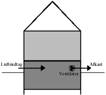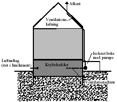 DB-8:Ventilation af krybekælder (aktiv)Funktion: Ved aktiv ventilation af krybekælder/rum under bygningens gulve bortledes forurenet luft, hvorved indeklimapåvirkningen reduceres. Strømningsretning (for den ventilerende luft) og influenszoner styres ved at kombinere "sug" med "luftindtag" fra riste placeret i fundamentet over terræn. Ved metoden sker en fortynding af den forurenede luft, idet kryberummets naturlige ventilation øges. Antal af udsugningspunkter er som regel mindre end antal luftindtag. Metoden er egnet til afværge mod indeklimapåvirkninger. Den aktive ventilation kan relativt nemt ombygges til passiv ventilation. Anlægsbeskrivelse: Ventilationsanlægget monteres udvendigt eller indvendigt i bygningen. Ved indvendig montage placeres anlægget (ventilatoren) et sted hvor støjfølsomheden er mindst mulig, eksempelvis i en baggang, et skunkrum eller lignende. Ved montage af ventilator i loftsrum eller lign. er det vigtigt at montagen sker med diffusionstætte samlinger og at den valgte ventilator er tæt. Modsat kan der ske en opkoncentrering af forureningsdampe i loftsrummet og en evt. efterfølgende forureningsspredning til de beboede lokaler. Ved en udvendig montage indbygges anlægget i over- eller underjordisk boks, lyskasse eller lign. (mål ca. 0,8 x 0,8 x 0,8 m), der med fordel lyddæmpes. Den udvendige boks med ventilator mv. kan placeres på terræn opad bygningen i en carport el. lign. Anlægget indeholder typisk vakuumpumpe og evt. simpel styring (on/off og evt. timerstyring), omdrejningsregulering (for regulering af flow) og kondensudskiller. For at undgå indsugning af varm udeluft (med høj fugtighed) kan der evt. indbygges fugt-/temperaturstyring på anlægget, hvorved indsugning i disse perioder undgås (eksempelvis ved temperatur over 18° C) Med fordel monteres ly ddæmpning på henholdsvis tilgangs- og afgangsrør fra ventilatoren. Evt. kondensvand bortledes manuelt urenset til offentlig kloak. Afkastluften udledes via afkasthætte over husets tag, eventuelt efter forudgående rensning via kulfilter. Typisk pumpestørrelse er 100- 300 W med en tilhørende kapacitet på 10 -300 m3/h. Anlægget kan drives ved pulserende eller kontinuert drift. Der kan pulseres på timebasis, anlægget kan stoppes om natten, eller der kan indbygges ventilationspauser af 1-2 måneders varighed. Driftsstrategien afhænger af de aktuelle forhold. Ved markant temperaturfald på gulvet, som følge af at varm fra boligen "suges" ned under gulvet, kan der indbygges varmeflader i ristene for luftindtag. Derved foretages en opvarmning af luften inden den ledes ud under gulvet. Der etableres ét eller flere udsugningspunkter med indtag under gulvet. Antal og placering afhænger af specifikke forhold som forureningskoncentration, byggetekniske forhold mv. Udsugningspunkterne etableres som ventilationsdræn indskudt i kryberummet under gulvet eller blot ved tilslutning af ventilationsledningen direkte på ventilationsristen i fundamentet. Ved placering af udsugningspunktet indvendig i boligen kan installationen ligeledes etableres enten blot som en "perforering" af gulvet eller ved installation af ventilationsdræn under gulvet. Ventilationsledninger mellem udsugningspunkter og ventilator placeres over- eller underjordisk. Ventilatoren har en forventet levetid på ca. 5 år. Anlægget er meget driftssikkert og har en stor robusthed. Luftindtag etableres i den overjordiske del af fundamentet og placeres typisk jævnt fordelt rundt om bygningen. Ofte med inddrages de eksisterende ventilationshuller. Effekt: Anlægget har effekt umiddelbart efter opstart. Der skal dog påregnes en kortere "indkøringsperiode", da der før opstart, pga. den kontinuerte forureningsfrigivelse fra jordmatricen og den samtidige tætte "overflade" ved beboelsens betongulve, og den relativt ringe luftudskiftning i krybekælderen, vil være sket en opkoncentrering af forureningsdampene under gulvene. Modsat dette sker der i driftsfasen en kontinuerlig bortledning af den forurenede poreluft i krybekælderen, hvorved "opkoncentreringen" vil være langt mindre udpræget, eller afhængig af den valgte driftsstrategi, evt. helt elimineret. Anlægget dimensioneres således mest hensigtsmæssigt for et lavere forureningsniveau end det i undersøgelserne påviste niveau. Når anlægget sættes i drift fjernes indledningsvist den opkoncentrerede "forureningsdyne" der står i kælderen og først herefter har foranstaltningen den fulde effekt. Indkøringsperioden må forventes at have en varighed af minimum en uge, hvorefter en "driftsligevægttilstand" vil indstille sig.