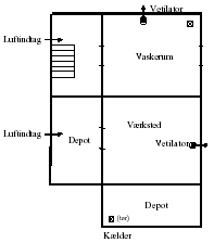 DB-3.1:Udskiftning af kældergulveGåskærgade 23, Haderslev, Sønderjyllands AmtForureningsscenarium: I bygningen har der tidligere været drevet renseri. Driftsperioden er ukendt, men renseriet var i drift i 1964. Ejendommen anvendes i dag til bolig. Der er påvist en kraftig forurening med chlorerede opløsningsmidler, primært PCE, jf. nedenstående figur 2 og tabel 1. Indeklimapåvirkningen vurderes primært at skyldes en afdampning fra en poreluftforurening under bygningen. Der er tidligere foretaget poreluftmålinger og vakuumekstraktion til belysning af kildestyrken under gulvene. Der er derved dokumenteret en kraftig poreluftforurening under gulvene. Poreluftmålingerne er gennemført som korttidsporeluftmåling. Ved udeluftmålinger er endvidere dokumenteret et udeluftbidrag svarende til baggrundsniveauet. De terrænnære jordbundsforhold består primært af sandet muldholdigt fyld underlejret af sand. Vandspejlet står ca. 4 m.u.t. Formål: Permanent foranstaltning der har til formål at nedbringe indeklimapåvirkning til et niveau under Miljøstyrelsens acceptkriterium. Bygning: Ejendommen er en ældre murstensvilla opført ca. 1750, i to plan. Ejendommen anvendes til bolig. Det samlede grundareal er ca. 90 m2. Under beboelsen er der en mindre kælder (ca. 10 m2) med murstens gulve. Gulvet er nedbrudt og med huller til den underliggende jord. Kælderen er ubenyttet. Etageadskillelsen mellem kælderen og stueplan er udført som trægulve uden nogen forventet tilbageholdelsesevne overfor en evt. afdampning fra kælderen. I den øvrige del af bygningen er betongulve. Bygningen er generelt i middelgod stand. Afværge: Afværgen er en kombineret løsning der er målrettet mod at nedsætte forureningsspredningen fra kælderen til den overliggende bolig. I kælderen er udstøbt 50 mm armeret betongulv. Udstøbningen er sket direkte ovenpå det eksisterende gulv. Kælderloftet er isoleret med 200 mm glasuld og bræddebeklædt med indbygget dampspærre. Endvidere er installeret en rumventilation (undertryk) i kælderen. Der ventileres 12 minutter pr. time svarende til et luftskifte på ca. 1 gang pr. time. Ventilatoren er indledningsvist indstillet til en ventilationskapacitet på 125 m3/h. Ventilatoren kan ikke omdrejningsreguleres. Ydelsen justeres ved periodisk drift vha. en timer. Ventilatorens støjniveau er ukendt. Der er monteret én eldreven ventilator og ingen luftindtag. Ventilatoren er monteret i kældervæggen ved siden af et eksisterende kældervindue og afkast er ført ud gennem kældervæggen. Afkastet fra ventilatoren er placeret umiddelbart på kældervæggens yderside. Der foretages løbende elafregning med amtet. Dokumentation: Primær dokumentation. Indeklimamåling i stue- og kælderetage (IK). Øvrig dokumentation. Poreluftmåling under gulv (korttidsmåling) Monitering til dokumentation af afværgens effekt er gennemført henholdsvis før og under drift af afværge. Effekt: Der er opnået en reduktion i PCE-indholdet i indeklimaet i kælderetagen på 38-60 % og en samtidig reduktion i stueetagen på 58-82%, jf. tabel 1. Den største effekt , i både kælder- og stueplan, opnås ved et luftskifte på ca. 1 gang pr. time. Modsat dette er den laveste effekt påvist ved et luftskifte på ca. 3 gange pr. time. Ved sammenligning af målinger gennemført henholdsvis "før" og "efter" skal det bemærkes at "før målingerne" er gennemført i marts måned, hvorimod "efter målingerne" er gennemført i henholdsvis maj og september måned med udeluftstemperaturer på op til 20° C. Det må derfor forventes at der i stueetagen kan være sket en øget udluftning i driftsperioden (åbne dører og vinduer). Tolkningen af resultaterne i stueetagen vil derved være behæftet med nogen usikkerhed. De påviste reduktioner i kælderen er opnået på baggrund af dels en ventilation i kælderetagen og dels en tætning af gulvkonstruktionen i kælderen. Reduktionen i stueetagen vurderes endvidere at skyldes der ved ventilationen etableres en ændret trykgradient, hvor strømningsretningen efter installationen permanent går fra stueetagen og ned mod kælderen (permanent undertryk i kælderen). Endvidere må det forventes at tætningen af etageadskillelsen mellem kælder og stueplan har er medvirkende effekt for opretholdelse af et konstant undertryk. Det kan dog også forventes at "membranen" bevirker, at der til kælderen indsuges relativt mere poreluft og dermed mere forurenet luft fra den omkringliggende jord, hvorved koncentrationen i kælderen bliver relativt højere end hvis "membranen" var undladt. Som konsekvens af de forhøjede indhold i stueetagen ved første målerunde (maj 2001) er luftskiftet ændret fra 1 til 3 gange i timen. Det ændrede luftskifte bevirker en ændret effekt i kælderetagen fra 60 % til 38 % og en ændret effekt i stueetagen fra 82% til 54 %. De gennemførte målinger tyder derved på undertrykket øges i kælderen (ved øget luftskifte) og derved resulterer i en øget indtrængning af opløsningsmidler til kælderen. Samtidigt ses undertrykket, i forhold til den overliggende stueetage, ikke er tilstrækkeligt til at hindre en øget forureningsspredning til stueetagen. Denne vurdering er dog noget usikker da der formodentlig også sker spredning via bygningens terrændæk. Den bedst opnåede effekt (1 gang pr. time) resulterer ikke i at indeklimapåvirkningen under drift nedbringes til et niveau under det fastsatte afdampningskriterium. På baggrund af dette overvejes løsningen pt. udviddet til at omfatte ventilationstiltag under bygningens terrændæk (øvrige gulve).