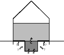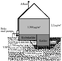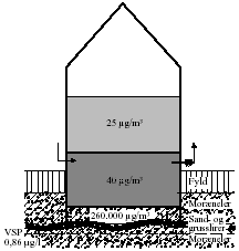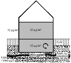 Figur 2: Når anlægget sættes i drift fjernes indledningsvist den opkoncentrerede "forureningsdyne" der står i kælderen og først herefter har foranstaltningen den fulde effekt. Indkøringsperioden må forventes at have en varighed af minimum en uge, hvorefter en "driftsligevægttilstand" vil indstille sig. Driftsligevægtstilstanden er den tilstand hvor der er ligevægt mellem forureningsfrigivelsen fra "kilden" og forureningsfjernelsen. Tidspunktet for hvornår ligevægtstilstanden indtræffer afhænger dels af forureningspotenitalet ved opstart og dels af med hvilken intensitet der ventileres. Der bortventileres i størrelsesordenen 50-200 m3/h, svarende til 8.000-40.000 luftudskiftninger under gulvet pr. år. (Ved en gennemsnitlig koncentration på f.eks. 5 mg PCE/m3 fjernes ca. 4 kg PCE/år). Der kan opnås reduktioner i indeklimapåvirkningen på op til 99 %. Miljøprofil: Negativ effekt. Et årligt elforbrug på ca. 700 kWh (COWI) (ved elenergi, et ressourceforbrug af kul og udledning af forbrændingsgasser). Mindre risiko for støjgener i rørsystemet. Indvendig rørføring kan udgøre en æstetisk gene. I sjældne tilfælde kan observeres en svag støj op gennem gulvet, fra sugepunktet placeret i det kapillarbrydende lag under gulvet. Ved metoden øges luftskiftet i boligen da luft fra stueetagen trækkes ned under gulvet. Luftskiftet i boligen øges med i størrelsesordenen 20 % svarende til ca. 10-20 m3/h (100 m2). I kolde perioder vil dette give anledning til et øget varmetab. Ved stor luftnedtrængning gennem gulvet i bygningen (stor lækage) kan der opstå røggener i forbindelse med brug af åben pejs eller lign. Foranstaltningen er varig. Positiv effekt. Indeklima forbedres og virkningen er hurtig. Etablering: Sugepunktet etableres ved at fjerne eventuelle belægninger hvor punktet/punkterne ønskes placeret. Gulvet gennembores og "sugerøret" monteres med en tæt og fleksibel samling i rørgennemføringen. Sugepunkterne placeres jævnt fordelt i boligen og under hensyntagen til evt. tværgående fundamenter. De pneumatiske forhold testes evt. i hvert enkelt sugepunkt. Punkter med afvigende og ringe ydelse kasseres og erstattes efter behov. Ventilationstest (kontrol af flow, modtryk og koncentration) danner evt. grundlag for valg af ventilator og danner endvidere beslutningsgrundlag for at vurdere om tilslutning af kulfilter er nødvendig. Evt. udvendig rørføring udføres om muligt i sort farve. Etableringsfasen er kort (1-2 uger). Forlænges dog lidt ved indvendig rørføring. Største gene for beboerne er gennemboring af gulvet (ca. 2 dage) og evt. arbejde med indvendig rørføring. Drift: Indkøring. Evt. indjustering af ydelser imellem de enkelte sugepunkter udføres ved opstart. Grundlag er ventilationstests og evt. felt-GC målinger under opstart. Drift. Efterfølgende, minimal justering (pr imært på baggrund af PID, evt. hver 2-6 md.). Minimal særskilt driftstekniks tilsyn (evt. hver 6. mdr.). Ventilator oftest vedligeholdelsesfri. Monitering: Indkøring. Moniteringen kan minimeres til en indledende dokumentation og begrænset efterfølgende kontrol og tilpasning. Eksempelvis dokumentation ved indeklimamålinger eller poreluftmåling under gulv. Til fastlæggelse af forureningsniveauet i den ekstraherede luft kan endvidere foretages måling af afkastluften ved passiv opsamling på kulrør eller felt-GC måling, alternativt ved måling under gulv eller udeluftmåling. Typisk efter 1 og 3 måneder. Drift. Derefter halvårligt/årligt måling på samlet afkastluft, alternativt ved måling under gulv eller udeluftmåling. Økonomi: Anlæg. 50.000 kr. Monitering (1. år). 5.000 kr., inkl. indkøring. Drift. 2.000 kr. Varmetab er ikke indregnet, da luftskiftet i boligen sjældent øges til mere end 0,5 gange i timen, hvilket Bygningsreglementet anbefaler for at sikre et godt indeklima (frisk lufttilførsel). Særlige opmærksomhedspunkter: En forudgående byggeteknisk gennemgang er vigtig. Ved denne gennemgang skal det bekræftes at der er et højpermeabellag under gulvet (kapillarbrydende lag) med en minimumstykkelse på 10 cm. Materiale fra finkornet sand og opefter i kornstørrelse. Det "kapillarbrydende lag" under ældre huse er af meget varierende karakter (fra ler til murbrokker). Placering af evt. tværgående fundamenter klarlægges for en vurdering af mulige strømningsmønstre ved forskellige scenarier for placering af sugepunkterne. Tværgående fundamenter under bygningen lokaliseres, da disse kan hindre den ønskede strømning. De pneumatiske forhold, influensradier osv. skal derfor her overvejes nøje inden endelig metodevalg og design. Geologiske forhold i de øvre jordlag, vandspejlsniveau og -variationer er ligeledes betydende parametre ved en vurdering af ventileringsmuligheder, strømningsmønstre, flowforhold, driftsstrategi mv. Endvidere skal det bemærkes at der ved en kraftig ventilation under trægulve, vil ske en øget strømning af indeluft fra den ovenliggende bolig ned gennem revner og sprækker i gulvet. Kondensering af varm luft under gulvet kan efterfølgende forårsage råd i konstruktionen. Efter endt "installation af sugepunkter" udføres efter behov ventilationstests på sugepunkterne inden valg af ventileringsenhed og færdig tilslutning. Ved montage af ventilator i loftsrum eller lign. er det vigtigt at montagen sker med diffusionstætte samlinger og at den valgte ventilator er tæt. Modsat kan der ske en opkoncentrering af forureningsdampe i loftsrummet og en evt. efterfølgende forureningsspredning til beboede lokaler. ____________________________________________________ Sammenfattende vurdering: Metoden er velegnet når der ønskes gennemført afværge mod indeklimapåvirkninger. Relativ god effekt i højpermeable zoner. Det skal bemærkes at der ikke sker nogen oprensning og at foranstaltningen derfor er permanent, med varige gener og tilsyn. Foranstaltningen er en relativ billig og hurtig løsning, med stor fleksibilite