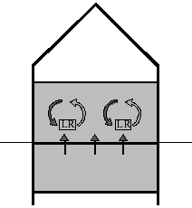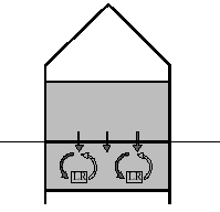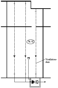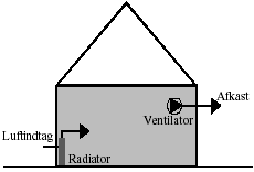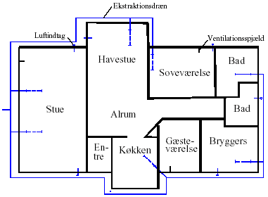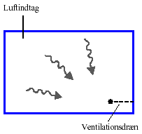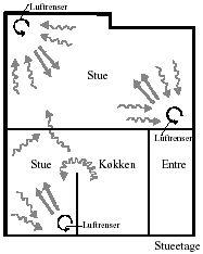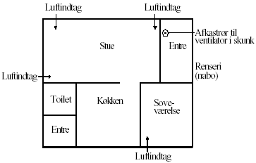 DB-5:Ventilation af stueetageFunktion: Ved at etablere en øget ventilation i stueetagen bortventileres forurenet indeluft, hvorved indeklimapåvirkningen i stuen reduceres (fortynding). Den øgede ventilation skaber samtidig et undertryk i stueetagen, hvorved muligheden for en luftspredning til evt. overliggende etager minimeres. Strømningsretning og influenszoner, for den ventilerende luft, styres ved at kombinere "udsugning" med "luftindtag". I flere lokaler i stueetagen etableres en kunstig lækage (luftindtag) med forbindelse til udvendigt terræn. Uden luftindtag vil lufttilførslen ske gennem tilfældige revner i fundamentet samt gennem revner og utætheder i gulv- og loftskonstruktionen. Antallet af udsugningspunkter svarer omtrent til antallet af luftindtag. Antallet af udsugningspunkter afhænger af forureningsgraden, de byggetekniske forhold og det nødvendige luftskifte i stueetagen. Der skal påregnes et luftskifte på min. 1 gang pr. time. Metoden anvendes som en permanent afværge (kontinuert drift) på ejendomme, der er påvirket i moderat grad og uden udeluftspåvirkning. Ved metoden foregår der ingen oprensning af forureningskilden. Anlægsbeskrivelse: Udsugningspunkterne påmonteres el-ventilatorer og etableres eksempelvis i stuevinduer eller ved gennemboring af overjordisk fundament. Støjgener kan minimeres ved at placere ventilatoren i et eventuelt loftrum i ejendommen. Ved en sådan montage er det nødvendigt at etablere en rørføring fra stue til loftsrum, hvorved anlægsudgiften øges markant. Ved montage af ventilator i loftsrum eller lign. er det vigtigt at montagen sker med diffusionstætte samlinger, og at den valgte ventilator er tæt. I modsat fald kan der ske en opkoncentrering af forureningsdampe i loftsrummet og en evt. efterfølgende forureningsspredning til de beboede lokaler. Ventilatorerne monteres med omdrejningsregulator (potentiometer, regulering af flow) og timetæller. (registrering af antal driftstimer). Timetæller og potentiometer indbygges f.eks. i en samlet styreboks, der monteres på væggen nær de enkelte udsugningspunkter (evt. aflåselig). På ejendommens el-tavle indbygges evt. en selvstændig gruppe til forsyning af elventilatorerne. Alternativt installeres elventilatorerne med forsyning fra eksisterende stikkontakter. Førstnævnte alternativ vil resultere i en merudgift på ca. 1.000 kr. Udsugningspunkter etableres med direkte forbindelse til udvendigt terræn og placeres så der sker en hensigtsmæssig bortledning og en naturlig fortynding af den bortventilerede forurenede luft. Ved placeringen tages der hensyn til eventuelle naboer og vinduer på overliggende etager, da der ellers kan ske indsugning af forurenet afkastluft. Som supplerende drivkraft kan det i nogle tilfælde udnyttes, at der på en af bygningens to modstående sider kan opstå relativt store trykforskelle (luv/læ). Det opståede differenstryk anvendes i såfald som supplerende drivkraft. Luftindtag etableres ved montage af rist efter gennemboring af ydervæg. Med henblik på at minimere nedkølingen af boligen som følge af indsugningen af udeluft installeres en luftgennemstrømningsradiator foran luftindtaget. Herved ledes den indsugede luft gennem radiatoren, hvor den forvarmes, før udstrømning til beboelsen. Luftindtag og udsugningspunkter placeres så risiko for kortslutning mellem to punkter minimeres, og således at der ikke opstår uventilerede zoner. Metoden med rumventilation er en velafprøvet teknik også i andre sammenhænge (f.eks. ved ventilation af vådrum). Effekt: Afværgen har effekt efter en ganske kort indkøringsperiode. En forurening under bygningen vil bevirke, at der sker en kontinuert frigivelse af forureningskomponenter og en ophobning i indeklimaet perioder uden ventilation. Ventilatoren dimensioneres efter at der sker en løbende bortledning, hvorfor tiltaget først har fuld effekt efter, at der opnås ligevægt mellem fjernelsen og tilførslen af forureningskomponenter (typisk efter ca. 4 døgns drift, svarende til 75- 125 luftudskiftninger i stueetagen). En elventilator ventilerer typisk 100 m3/t (afhængig af model og regulering). Ved etablering af tre ventilatorer i en stueetage på 110 m2 og med en loftshøjde på ca. 2,3 meter opnås der en luftudskiftning i stueetagen ca. 10.000 gange pr. år. Ved en gennemsnitlig PCE koncentration på f.eks. 25 µg/m3 fjernes således ca. 65 g PCE/år. Ventilationen bevirker endvidere at der etableres et svagt undertryk i stueetagen, hvilket minimerer transporten af forurenet indeluft til eventuelle overliggende etager.
