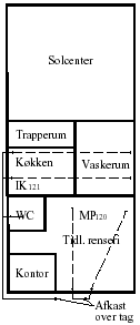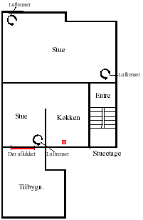 Fremtidig. Anlægget er på nuværende tidspunkt demonteret, idet feltafprøvningen i forbindelse med projekt "Tidlig indsats" er afsluttet. Ved et ønske om fortsat afværge skulle anlægget have været opstillet i kælderetagen i stedet for i stueetagen. Se endvidere datablad DB6.2. Tid: Før indsats. Anlægget er idriftsat 6 måneder efter at forureningen er påvist og afværge er skønnet nødvendig. Anlægsperiode. ½ dag, under forudsætning af at luftrenseenhederne er leveret. Alternativt skal der påregnes ca. 3 ugers leveringstid. Drift. Opstart, september 2001. Anlæg demonteret, december 2001. Økonomi: Etablering. 27.000 kr. (for 3 stk. luftrensere (LR1)). Udført monitering. 44.000 kr. (4 målerunder med IK, MP og UL). (I henhold til anbefalet monitering, jf. datablad DB-7, er der således udført målinger før opstart af afværge samt efter 1 og 2 måneders drift). Drift. 5.000 kr. årligt (inkl. én udskiftning af støv- og kulfiltre). ______________________________________________ Samlet vurdering: Afværgen har kørt uden driftstop. Det anbefales, at udforme installationen således at beboere eller andre ikke kan slukke for anlægget ved et uheld. Den indbyggede timetæller kan registrere den aktuelle driftstid. Afværgen med installation af luftrensere er et hurtigt, fleksibelt, billigt og relativ effektivt tiltag. Endvidere kan luftrenserne relativt nemt integreres i et eksisterende møblement. Støj fra luftrenseenhederne har, trods støjdæmpning (ca. 33 dB(A) målt for én luftrenser, 1 meter fra kilden), været en gene/irritation for beboerne. Støjen har virket særlig markant ved overgangen mellem stue og spisestue, hvor der i begge lokaler er opstillet luftrensere. Endvidere har støjen været en gene i de specifikke situationer, hvor der ikke har foregået andre aktiviteter i bygningen (f.eks. tv, legende børn, emhætte mv.). Den aktuelle afværge, med opstilling af luftrensere i stueetagen, har haft til formål at reducere indeklimapåvirkningen i stueetagen fra såvel udeluftbidrag (fra et nærliggende PCE/TCEafkast) som fra bidrag fra en poreluftforurening under bygningen. Såfremt det på en given lokalitet vurderes, at der ikke er noget udeluftbidrag til indeklimapåvirkningen anbefales det, at opstille luftrenserne i kælderetagen for derved at minimere støj og pladskrav og endvidere for at foretage afværge tættere på kilden. Derved kan afværgen have effekt på indeklimakoncentrationen i både kælder- og stueetagen (jf. DB-6.2 "Luftrensning i kælderetage"). Bilag: Fotos. Ejendommen, luftrensere opstillet i stueetage.