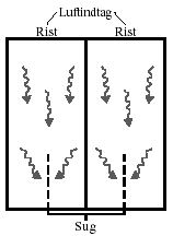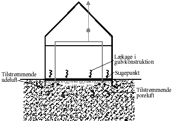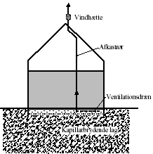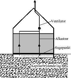DB-12:Ventilation af kapillarbrydende lag (aktiv uden luftindtag)Funktion: Ved ventilation af det kapillarbrydende lag under gulvet etableres et svagt undertryk i det kapillarbrydende lag. Ved undertrykket strømmer indeluften fra huset ned til det kapillarbrydende lag og minimerer derved indtrængningen af forurenet poreluft til huset. Ensartede strømningsforhold i det ventilerede jordlag er betinget af en ensartet tæthed i terrændækket og en ensartet permeabilitet i det ventilerede lag. Ved metoden anvendes ikke luftindtag som beskrevet ved den sammenlignelige teknik på DB 11. Eventuelle lokale lækager eksempelvis samlinger ved vægge, revner i gulvet, rørgennemføringer mv. kan derfor få afgørende betydning hvilke influenszoner der opnås. Dette kombineret med en eventuel inhomogeniteten i det ventilerede lag gør at metoden er behæftet med større usikkerhed end når der etableres "sug" i kombination med "luftindtag" (se evt. DB10 og DB 11). I ældre huse hvor der ofte ses stor uensartethed i det "kapillarbrydende lag", vil det således ofte være fordelagtigt at installere luftindtag som beskrevet i teknikken DB 10 og DB 11. Det er vigtigt at, der etableres en fleksibel lufttæt samling ved rørgennemføringer i gulvet ved sugepunktet, da der ellers er stor risiko for at der sker kortslutning således at ren luft fra boligen alene trækkes ned ved rørgennemføringen. Influensradius bliver derved meget lille. Der etableres et eller flere sugepunkter i det kapillarbrydende lag (oftest 2-4 stk.). De bedste strømningsforhold opnås under en tæt gulvoverflade (betongulv). Ved aktiv ventilation installeres en mekanisk ventilator som drivkraft. Metoden er relativ uafhængig af de geologiske forhold, når blot der i gulvopbygningen indgår et højpermeabelt lag (kapillarbrydende lag). Der sker ingen direkte oprensning ved metoden. Foranstaltningen vil derfor være permanent. Metoden med aktiv ventilation af det kapillarbrydende lag uden luftindtag er velafprøvet. Anlægsbeskrivelse: Ventilationssugepunkterne placeres umiddelbart under gulv, midt i det apillarbrydende lag. Fra sugepunktet/punkterne føres afkastsrør (ca. ø63 mm) enkeltvis eller fælles op gennem bygningen og tilsluttes én fælles ventilator placeret i bygningens loftsrum, skunkrum eller lignende. De enkelte aftræksrør monteres evt. reguleringsventiler således at "suget" fra de enkelte punkter kan reguleres indbyrdes. Alternativt foretages montage uden reguleringsmulighed. Ved indvendig rørføring udnyttes termisk opdrift (varm luft stiger opad) som supplerende drivkraft. En indvendig rørføring placeres så evt. støjgener minimeres. Alternativt kan røret føres udvendig og da i en mørk farve der om muligt placeres i solsiden, for igen at udnytte termisk opdrift som supplerende drivkraft. Viser det sig, at forholdene er gunstige for en lavere ventilationsgrad udskiftes motorventilatoren relativt nemt/billigt med en vinddreven ventilator. Motor- og vinddrevne ventilatorer er meget driftssikre og robuste (for nærmere omtale af vindhætte henvises til DB 11). Den eldrevne ventilator placeres således at evt. støjgener minimeres, dvs. længst væk fra soverum og lignende og således at der ikke opstår unødig vibration i nærtliggende konstruktioner (vandrør eller lign.). Placering af afkast skal nøje overvejes under hensyntagen til eksempelvis tagvinduer, hvor der kan ske indsugning af urenset aftræksluft. I det enkelte tilfælde skal overvejes om rensning af afkastluft er nødvendig (ved kulfiltrering). Der kan forventes en samlet levetid på ca. 10 år. Effekt: Installationen har effekt stort set umiddelbart efter opstart. Der skal dog påregnes en kortere "indkøringsperiode", da der før opstart, pga. den kontinuerte forureningsfrigivelse fra jordmatricen og den samtidige tætte "overflade" ved beboelsens betongulve, og den relativt ringe luftudskiftning i krybekælderen, vil være sket en opkoncentrering af forureningsdampene under gulvene. I driftsfasen sker der imidlertid en kontinuerlig bortledning af den forurenede poreluft, hvorved "opkoncentreringen" vil være langt mindre udpræget eller, afhængig af den valgte driftsstrategi, evt. helt elimineret. Anlægget dimensioneres således mest hensigtsmæssigt for et lavere forureningsniveau end det i undersøgelserne påviste niveau.