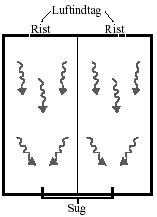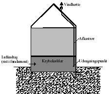 DB-9:Ventilation af krybekældre (passiv)Funktion: Ved passiv ventilation af krybekælder/ rum under bygningens gulve bortledes forurenet luft, hvorved indeklimpåvirkningen reduceres. Strømningsretning (for den ventilerende luft) og influenszoner styres ved at kombinere "sug" med "luftindtag" fra riste placeret i fundamentet over terræn. Ved metoden vil der ske en fortynding af den forurenede luft, idet kryberummets naturlige ventilation øges. Antal af udsugningspunkter er som regel mindre end antal luftindtag. Metoden er egnet til afværge mod indeklimapåvirkninger. Ved passiv ventilation anvendes alene vedvarende energiformer (sol, vind m.v.) Den passive ventilation kan relativt nemt ombygges til aktiv ventilation. Der sker ingen oprensning ved metoden. Foranstaltningen vil derfor være permanent. Anlægsbeskrivelse: Der etableres ét eller flere udsugningspunkter med indtag under gulvet. Antal og placering afhænger af specifikke forhold som forureningskoncentration, byggetekniske forhold mv. Udsugningspunkterne etableres som ventilationsdræn indskudt i kryberummet under gulvet eller blot ved tilslutning af ventilationsledningen direkte på ventilationsristen i fundamentet. Ved placering af udsugningspunktet indvendig i boligen kan installationen ligeledes etableres enten blot som en "perforering" af gulvet eller ved installation af ventilationsdræn under gulvet. Ved markant temperaturfald på gulvet, som følge af at varme fra boligen "suges" ned under gulvet, kan der indbygges varmeflader i ristene for luftindtag (sjældent nødvendigt). Ventilationsrør ved terræn (mellem ventilationsdræn og aftræksrør) placeres enten over- /eller underjordisk. Aftræksrør (lodret) føres indvendigt eller udvendigt i bygningen. Ved indvendig rørføring udnyttes termisk opdrift (varm luft stiger opad) som supplerende drivkraft. Indvendig rørføring placeres så evt. støjgener minimeres. Ved udvendig rørføring udføres røret i mørk farve og placeres typisk i solsiden, for igen at udnytte termisk opdrift som supplerende drivkraft. Der anvendes typisk vinddrevne ventilatorer af typen Supa Vent 10". Ønskes en øget ventilation udskiftes vindhætte relativt nemt/billigt med motordrevet ventilator (aktiv ventilation). Vinddrevne ventilatorer er meget driftssikre og har stor robusthed. Vindhætter placeres nøje under hensyntagen til fremherskende læ- og luvforhold. Som alternativ drivkraft til vindhætter over tag, kan det i nogle tilfælde udnyttes, at der på en bygningens to modstående sider kan opstå relativt store trykforskelle (luv/læ). Ved denne metode skal det dog sikres at der ikke er risiko for indsugning af forurenet luft ved luftindtaget. Differenstrykket anvendes her som drivkraft. Placering af afkast skal nøje overvejes under hensyntagen til eksempelvis tagvinduer, hvor der kan ske indsugning af urenset aftræksluft. I det enkelte tilfælde skal overvejes om rensning af afkastluft er nødvendig (ved kulfiltrering). I givet fald kan det ofte, pga. modtryk i kulfilteret, blive nødvendigt at indbygge en motor-ventilator i stedet for vinddreven ventilation (aktiv ventilation). Som reguleringsmulighed indbygges eventuelt ventiler på de enkelte - eller udvalgte ventilationsdræn. Anlægget er meget driftssikkert og har en stor rubusthed. Luftindtag etableres i den overjordiske del af fundamentet og placeres typisk jævnt fordelt rundt om bygningen. Ofte med inddrages de eksisterende ventilationshuller.Der kan forventes en samlet levetid på ca. 10 år. Effekt: Installationen har effekt stort set umiddelbart efter opstart. Der skal dog påregnes en kortere "indkøringsperiode", da der før opstart, pga. den kontinuerte forureningsfrigivelse fra jordmatricen og den samtidige tætte "overflade" ved beboelsens betongulve, og den relativt ringe luftudskiftning i krybekælderen, vil være sket en opkoncentrering af forureningsdampene under gulvene. Modsat dette sker der i driftsfasen en nogenlunde kontinuerlig bortledning af den forurenede poreluft i krybekælderen, hvorved "opkoncentreringen" vil være langt mindre udpræget.