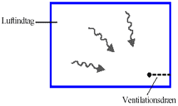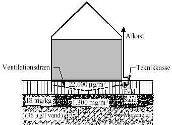 DB-10:Ventilation af kapillarbrydende lag (passiv med luftindtag)Funktion: Ved ventilation af det kapillarbrydende lag (højpermeabelt lag) under gulvet bortledes forurenet luft, således at indeklimapåvirkningen minimeres. De bedste strømningsforhold opnås under en tæt gulvoverflade (betongulv). Strømningsretning og influenszoner, for den ventilerede luft, styres ved at kombinere "sug" med "luftindtag". Der etableres kunstig lækage (luftindtag) i flere punkter under gulvet, med forbindelse til udvendigt terræn. Uden luftindtag vil lufttilførslen ske gennem tilfældige revner i fundamentet, revner og utætheder i gulvkonstruktionen og/eller lækage mod udvendigt terræn via ventilationsdrænene. Antal ventilationsdræn (sug) svarer omtrent til antal luftindtag. Luftindtagene placeres i samme dybde som ekstraktionsdrænene hvorved muligheden for at hele porevolumenet under bygningen gennemgår en løbende udskiftning (optimalt influensområde) bedres. Ved passiv ventilation anvendes alene vedvarende energiformer (sol, vind osv.) Metoden er relativ uafhængig af de geologiske forhold, når blot der i gulvopbygningen indgår et højpermeabelt lag (kapillarbrydende lag). Der sker ingen direkte oprensning ved metoden. Foranstaltningen vil derfor være permanent. Metoden med passiv ventilation af det kapillarbrydende lag er velafprøvet. Anlægsbeskrivelse: Ventilationsdrænene placeres umiddelbart under gulv, midt i det kapillarbrydende lag. Ventilationsrør ved terræn (mellem ventilationsdræn og afkastrør) placeres enten over- /eller underjordisk. Afkastrør (lodret) føres indvendigt eller udvendigt i bygningen. Ved indvendig rørføring udnyttes termisk opdrift (varm luft stiger opad) som supplerende drivkraft. Indvendig rørføring placeres så evt. støjgener minimeres. Ved udvendig rørføring udføres røret i mørk farve og placeres typisk i solsiden, for igen at udnytte termisk opdrift som supplerende drivkraft. Der anvendes typisk vinddrevne ventilatorer af typen Supa Vent 10". Ønskes en øget ventilation udskiftes vindhætte relativt nemt/billigt med motordrevet ventilator. Vinddrevne ventilatorer er meget driftssikre og har stor robusthed. Vindhætter placeres nøje under hensyntagen til fremherskende læ- og luvforhold. Som alternativ drivkraft til vindhætter over tag, kan det i nogle tilfælde udnyttes, at der på en bygningens to modstående sider kan opstå relativt store trykforskelle (luv/læ). Ved denne metode skal det dog sikres at der ikke er risiko for indsugning af forurenet luft ved luftindtaget. Differenstrykket anvendes her som drivkraft. Placering af afkast skal nøje overvejes under hensyntagen til eksempelvis tagvinduer, hvor der kan ske indsugning af urenset aftræksluft. I det enkelte tilfælde skal overvejes om rensning af afkastluft er nødvendig (ved kulfiltrering). I givet fald kan det, pga. modtryk i kulfilteret, blive nødvendigt at indbygge en motorventilator i stedet for vinddreven ventilation. Som reguleringsmulighed indbygges eventuelt ventiler på de enkelte - eller udvalgte ventilationsdræn. Der kan forventes en samlet levetid på ca. 10 år. Effekt: Installationen har effekt stort set umiddelbart efter opstart. Der skal dog påregnes en kortere "indkøringsperiode", da der før opstart, pga. den kontinuerte forureningsfrigivelse fra jordmatricen og den samtidige tætte "overflade" ved beboelsens betongulve, vil være sket en opkoncentrering af forureningsdampene under gulvene. Modsat dette sker der i driftsfasen en nogenlunde kontinuerlig bortledning af den forurenede poreluft i krybekælderen, hvorved "opkoncentreringen" vil være langt mindre udpræget. I længerevarende vindstille perioder kan der dog igen ske en vis opkoncentrering med forureningsspredning til bygningen som følge. Indkøringsperioden må forventes at have en varighed af minimum en uge, hvorefter en "driftsligevægttilstand" nogenlunde vil indstille sig (afhængig af vejrforholdene og vindhætternes placering). Driftsligevægtstilstanden er den tilstand hvor der er ligevægt mellem forureningsfrigivelsen fra "kilden" og forureningsfjernelsen. Der bortventileres i størrelsesordenen 2-10 m3/h, svarende til 1.000-5.000 luftudskiftninger under gulvet pr. år. (Ved en gennemsnitlig koncentration på f.eks. 5 mg PCE/m3 fjernes ca. 250 g PCE/år). Der kan opnås reduktioner i indeklimapåvirkningen på op til 99 %.
