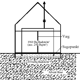 DB-12.1:Ventilation af kapillarbrydende lag (aktiv uden luftindtag)Hus nr. 4185 - Radon 95 (Risø)Forureningsscenarium: Bygningen er beliggende i et radonpåvirket område. Der er påvist en markant overskridelse af det fastsatte acceptable niveau på 200 Bequerel pr. kubikmeter (Bq/m3) jf. nedenstående figur 2 og tabel 1. Påvirkningen stammer alene fra radon bidrag under bygningen. Formål. Permanent foranstaltning der har til formål at nedbringe indeklimapåvirkning til et niveau under (200 Bq radon/m3). Bygning: Huset er et etplans parcelhus opført i 1970, med en tilbygning opført sidst i 1980'erne. Grundplan ca. 180 m2. Ingen kælder. Ejendommen er i almindelig pæn stand. Betongulve med kapillarbrydende lag (grus, skærver). Flere revner i gulvet. I tilbygningen er en konvektorgrav (radiator i gulv) langs facadepartiet. Afværge: Aktiv ventilation af kapillarbrydende lag (uden luftindtag). 3 sugepunkter med en diameter på ø 110 mm (mindre dimension kan anvendes uden problemer, da tryktabet i installationen er relativt lille, eks, ø63 mm),. Sugepunkterne er installeret ved gennemboring af gulvet med diamantskærer og nedpresning at et plastrør i det kapillarbrydende lag. Omkring rørgennemføringen er ikke foretaget tætning, da lækagerisikoen ikke er vurderet at være betydende ved det aktuelle "sug". Røret er herefter ført synligt i bygningen fra hvert af de tre sugepunkter lodret op til loftetagen. De tre afkastsrør samles i loftsrummet og føres i et fællesrør hen til ventilatoren (230 V, 0,07 W). I bryggerset er monteret en kontrolboks indeholdende omdrejningsregulator (regulering af ydelse) og vakuummeter fra kontrol af vakuum. Ventilatorens omdrejning reguleres trinløst. Maks. ydelse er 230 m3/h (fritløbende) Beregnet ydelse under drift er ca. 150 m3/h ved 1,2 mbar. Der har ikke været påmonteret kulskifte da foranstaltningen er iværksat som radonforanstaltning. Kontrolboksen indeholder omdrejningsreulator og vakuummeter og er monteret uaflåst i husets bryggers. Der er ingen fjernovervågning eller alarmoverførsel ved driftsstop. Evt. kulfilter vil nedsætte ydelsen markant pga. et væsentligt øget modtryk. Støjniveauet i loftsrummet er ukendt. Dokumentation: Primær dokumentation. Indeklimamålinger (IK-radon) og poreluftmålinger nær bygningen (PL). Indeklimamålingerne anvendes direkte som dokumentation af den opnåede effekt. Måling i poreluften nær bygningen har til formål at dokumenterer forureningsniveauet i bygningens nærområde. Øvrig dokumentation. Trykmåling og lufthastighedsmåling i aftrækskanal. Trykmåling i poreluftsonder nær bygningen. Luftskiftemålinger i bygningen. Lufthastighedsmåling i aftrækskanalen anvendes til beregning det aktuelle flow. Trykmålinger i poreluftsonder anvendes til at vurderer de opnåede influensradier som resultat af den igangsatte ventilation. Luftskiftemålinger anvendes som et supplement for vurdering af effekten. Effekt: Der er i stueplan opnået en reduktion af radonindhold i indeklimaet på 95 % jf. tabel 1. Den opnåede effekt, målt ved IK, viser en afdampning til indeklima under drift af foranstaltningen på et niveau under det fastsatte acceptkriterium. I aftrækskanalen er påvist et undertryk på 1,2 mbar (flow ca. 150 m3/h). Der er påvist et undertryk på 0,0003 mbar (3 Pa) i en afstand af ca. ½ meter fra bygningen (poreluftsonde 1 m u.t.), hvilket vurderes at dokumenterer en trykkobling (årsagssammenhængende trykforhold) imellem suget under bygningen og området omkring poreluftsonden. Der påvises under drift et øget luftskifte i bygningen (+20% svarende til ca. +30 m3/h). Luftskiftet (stue og soveværelse) ændres under drift fra ca. 0,34 gange pr. time til ca. 0,46 gange pr. time.