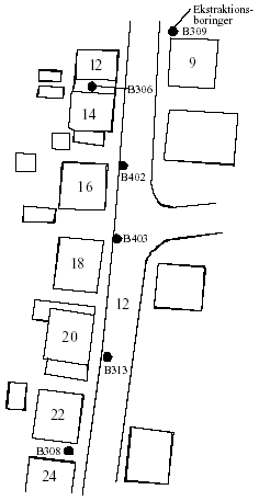DB-13.1: Ekstraktionsboringer (lodrette)Engvej 9-24, Viborg AmtForureningsscenarium: Forureningen berører 8 ejendomme der er beliggende udenfor kildeområdet, men over en grundvandsfane forurenet med chlorerede opløsningsmidler. Der er påvist en kraftig forurening i poreluften og grundvandet jf. nedenstående figur 2 og tabel 1. Indeklimapåvirkningen vurderes alene at stamme fra bidrag under bygning (afdampning fra grundvandet). Vandspejlet står ca. 7 m u.t. Der er finkornet sand indtil niveau under grundvandspejlet. Afværge i kildeområdet (vakuumekstraktion og airsparging samt afværgepumpning), pågår sideløbende med foranstaltningen. Formål: Tiltaget er iværksat som en del af et større afværgeprojekt. Formålet har været at nedbringe en svag til moderat indeklimapåvirkning i en række bygninger over grundvandsfanen. Foranstaltningen er af "permanent" karakter (indtil endt oprensning) Bygning: De berørte ejendomme er alle ældre murstensvillaer, opført ca. 1930. Grundplan er gennemsnitligt ca. 110 m2. Alle på nær én er opført med 1. sal og alle med kælder. Bygningerne er i varierende stand, fra god til meget ringe. Bygningerne i ringe stand har kraftige revner i gulve og vægge. Alle bygninger er opført med betongulve. Det kapillarbrydende lag er for alle bygningerne af varierende karakter. Afværge: Vakuumventilation af de terrænnære jordlag indtil ca. 7 m u.t. Der er etableret 6 lodrette boringer til afværge og oprensning i den umættede zone under 8 ejendomme. Boringerne er etableret som traditionelle 6" snegleboringer, filtersat ca. 4-9 m u.t., filtermateriale i ø63 mm PEH, monteret 2 lag filtervæv. Boringsafslutningerne er etableret i ø 315 mm korrugeret opføringsrør med kegle og kørebanedæksel. Filterrøret er påmonteret snapkobling. Ekstraktionsanlægget er indbygget i en støjdæmpet trækvogn (mål: ca. 0,8 x 1,5 x 1,5) med vakuumpumpe (0,37kW), kondensudskiller, kulfilter (20 kg, aktiv kul type WS45) og flowmåler. Der er ingen fjernovervågning af anlægget og ingen ventilation af selve vognen. Der er iværksat en periodisk ekstraktion med ca. 14 dages kontinuert ekstraktion i hver af de 6 boringer (ca. 30 m3/h ved -150 mbar). Det første år er der ekstraheret 3 gange i hver boring, først med en måneds pause, dernæst med 6 måneders pause. De efterfølgende år er der ekstraheret ca. én gang årligt i hver boring. Kondensvand afledes manuelt til kloak (ca. 1/4 liter pr. år). Støjniveauet er ca. 35-40 dB(A). Der foretages en udskiftning af poreluften under bygningerne ca. 100-150 gange pr. år ved 3-6 ugers ekstraktion pr. år. Ekstraktionsanlægget er ved alle boringer, undtagen én parkeret direkte over ekstraktionsboringerne. Den overjordiske rørføring er derved kort og med minimal gene for de daglige aktiviteter i området. Ekstraktionsanlægget forsynes med strøm fra de enkelte ejendomme og med en årlig elafregning til grundejerne. Dokumentation: Primær dokumentation. PIDmålinger og konstant logning af det samlede flow i ekstraktionsboringerne. PID-målingerne har til formål at dokumentere forureningsindholdet i ekstraktionsboringerne med henblik på fastlæggelse af ekstraktionsperiodernes længde og frekvens. Flowmålingen dokumenterer anlæggets ekstraktionsforløb. Øvrig dokumentation. Korttidsporeluftmålinger under gulv (senere afløst af passiv opsamling under gulv, MP). Målingerne under gulv er et supplement til PID-målingerne og dokumenterer hvorvidt ekstraktionen skal genstartes. Det målte indhold under gulv er omregnes til et teoretisk indhold i indeklimaet. Målingerne er ikke gennemført i alle ejendommene, men derimod ved "stikprøver" i ca. hver anden ejendom over fanen.