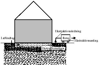 DB-14: Dræn under gulveFunktion: Ved vakuumekstraktion i det permeable lag under bygningen bortledes forurenet luft hvorved forureningspotentialet under gulvene nedbringes og dermed også indeklimapåvirkningen. Samtidig foretages en lokal oprensning af porevolumenet under bygningen (svarende til få meter under bygningen ). Strømningsretning og influenszoner, for den ventilerede luft, styres ved at kombinere "sug" med "luftindtag". Der etableres kunstig lækage i flere punkter under gulvet, med forbindelse til udvendigt terræn. Luftindtagene placeres i samme dybde som ekstraktionsdrænene. Det sikres således at hele porevolumenet under bygningen gennemgår en løbende udskiftning og herved, at et optimalt influensområde for ventilationen opnås. Uden luftindtag vil lufttilførslen ske gennem tilfældige revner i fundamenter og gulvkonstruktionen og/eller via lækage mod udvendigt terræn via ekstraktionsdrænene. Antal ekstraktionsdræn (sug) svarer omtrent til antal luftindtag. Metoden er velegnet til oprensning og afværge mod i indeklimapåvirkninger i områder hvor de øvre jordlag under bygningerne (minimum ½ meters dybde) er af højpermeabel karakter (sand). Metoden er velafprøvet. Anlægsbeskrivelse: Ekstraktionsanlægget indbygges i en overdækket støjdæmpet trailer (mål: ca. 1,5 x 3 x 2m.). Anlægget indeholder typisk komponenter som; vakuumpumpe, kondensudskiller, kulfilter/filtre (kultype AP4-60) flowmåler og simpel SRO (Styring, regulering og overvågning). Kondensvand bortledes typisk urenset til offentlig kloak (små mængder, i størrelsesordenen 10-200 l./år). Typisk pumpestørrelse 1-2 kW. Der indbygges ventilation af vognen. Anlægget drives ved pulserende eller kontinuerlig driftsform. Der kan f.eks. pulseres på timebasis, eller der kan indbygges ekstraktionspauser af 1-2 måneders varighed eller blot natpause. Driftsstrategi afhænger af de aktuelle forhold (forureningsniveau, pneumatiske forhold, beboernes ønsker o.lign.). Fjernoverførsel af alarm ved driftsstop anbefales. Styring og overvågning bør udformes simpelt. Eksempelvis omfattende følgende alarmer; pumpeudfald, strømudfald, alarmudfald, indbrud i anlæg og kondenstømning. Endvidere kan indbygges en fjernbetjeningsmulighed for vakuumpumpen (on/off) og evt. en temperaturføler til overvågning af rumtemperaturen i anlægget. Ekstraktionsanlægget er meget driftssikker og har stor robusthed. Ekstraktionsanlægget tilsluttes ekstraktionsdrænene via ekstraktionsledninger, der føres over eller underjordisk. Ekstraktionsdræn placeres umiddelbart under gulvet, ½-1 meter under indvendig gulvoverflade. Ved indløb i ekstraktionsanlægget (monteret som manifold), eller i brønde ved ekstraktionsdrænene monteres reguleringsventiler, således at der kan foretages en indregulering imellem de enkelte dræn. Der kan forventes en levetid på ca. 10 år. Effekt: Anlægget har effekt stort set umiddelbart efter opstart. Der skal dog påregnes en kortere "indkøringsperiode", da der før opstart, pga. den kontinuerte forureningsfrigivelse fra jordmatricen og den samtidige tætte "overflade" ved beboelsens betongulve, vil være sket en opkoncentrering af forureningsdampene under gulvene. Modsat dette sker der i driftsfasen en kontinuerlig bortledning af den forurenede poreluft, hvorved "opkoncentreringen" vil være langt mindre udpræget eller, afhængig af den valgte driftsstrategi, evt. helt elimineret. Anlægget dimensioneres således mest hensigtsmæssigt for et lavere forureningsniveau end det i undersøgelserne påviste niveau. Når anlægget sættes i drift fjernes indledningsvist den opkoncentrerede "forureningsdyne" der står under gulvene og først herefter har foranstaltningen den fulde effekt. Indkøringsperioden må forventes at have en varighed af minimum en uge, hvorefter en "driftsligevægttilstand" vil indstille sig. Driftsligevægtstilstanden er den tilstand hvor der er ligevægt mellem forureningsfrigivelsen fra "kilden" og forureningsfjernelsen. Tidspunktet for hvornår ligevægtstilstanden indtræffer afhænger dels af forureningspotenitalet ved opstart og dels af med hvilken intensitet der ekstraheres. Oprensningen kan, afhængig af den lokale geologi, opfyldningsforhold osv., forventes at have en vertikal influenszone på 1½-2 meter og en horisontal influenszone svarende til minimum beboelsens udbredelse. Der bortventileres i størrelsesordenen 50-100 m³/h, svarende til 5-20.000 luftudskiftninger under gulvet pr. år (Ved en gennemsnitlig koncentration på f.eks. 50 mg PCE/m3 fjernes 4 kg PCE/md.). Der kan opnås reduktioner i indeklimapåvirkningen på op til 99 %. Er der alene tale om en terrænnær forurening til gene for indeklimaet, kan der typisk opnås oprensning indenfor 1-3 år.