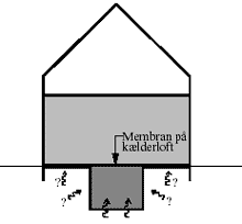 Perforeringen tætnes som beskrevet ovenfor. Det anbefales dog, hvor det er muligt at anvende færdig svejste membranflader. I større rum (over 15 m²) må det dog forventes at være nødvendigt at opdele membranen i mindre flader af hensyn til montagen. Et hvert overlæg udføres minimum med et tæthed som beskrevet ovenfor. Ved en indledende besigtigelse foretages en vurdering af hvordan montagen kan gennemføres. Placering af rørgennemføringer (faldstammer, vandrør, radiatorer mv.) kan være afgørende for om der kan anvendes færdigsvejste membranstykker (rumvis) eller om samling på stedet vil være nødvendig. Færdigsvejste membrankraver i passende dimensioner kan medlevers fra leverandøren. Montagen må efterfølgende ske i henhold til ovenstående. En øget tæthed i membranens samlinger kan opnås ved svejsning på stedet. Pga. en ringe udbredelse af teknikken (svejsning i R.A.C membraner) er dette i provinsen forbundet med relativt store ekstraudgifter. I hjørner må der ikke foretages tilskæring af membranen. Membranen foldes for derved at minimere risikoen for lækage i hjørnerne. Ved foranstaltningen reduceres den eksisterende frihøjde med ca. 5 cm. Foranstaltningen kan efter behov nemt udviddes til at omfatte eksempelvis en ventilation af kælderen. For en nærmere beskrivelse af denne henvises til datablad DB4. Det skal bemærkes at samlinger ved overlæg på membranen, ved rørgennemføringer og langs lodrette flader er et meget sårbart punkt ved teknikken. Fejlagtig montage eller sjusk kan resultere i markant nedsat effekt eller evt. ingen effekt. Overordnet set kan etableringsarbejdet sammenlignes med en traditionel arbejdsbeskrivelse vedrørende indbygning af diffusionstætte membraner, udført med skærpet opmærksomhed, jf. ovenstående. Metoden (montage på kælderloft) er ikke tidligere afprøvet. Effekt: Afværgen vil have effekt umiddelbart efter anlægsarbejdet er afsluttet. Ved tætning med en diffusionstæt membran, vil det udførte arbejde i membransamlinger, tætninger langs rørgennemføringer og langs lodrette flader være foranstaltningens absolutte sårbare punkt. Metoden er derfor behæftet med nogen usikkerhed. Der kan ikke påregnes 100 % tætning. Metoden hvor der foretages montage på kælderloftet er ikke tidligere afprøvet, hvorfor der ikke foreligger praktiske erfaringer med foranstaltningen. Ved udenlandske projekter, hvor diffusionstætte membraner er udlagt under tæpper i beboelsen er påvist reduktionseffekter på op til 50%. Samtidig konkluderes det at det ved metoden er vanskelig at opnå en væsentlig højere effekt og dette primært pga. den vanskelige montage. Der påregnes derfor en fortsat diffusiv og konvektiv forureningsspredning visse steder. Montage på kælderlofter vurderes at være behæftet med omtrent samme usikkerhed og samme effekt. Bl.a. på baggrund af dette vurderes det muligt at opnå reduktioner i indeklimapåvirkningen på 10- 50 %. Vurderingen er behæftet med stor usikkerhed. Miljøprofil: Negativ effekt. Foranstaltningen vil indebære, at beboerne udsættes for støjgener i begrænset omfang (etablering "forskalling"). I anlægsfasen må det forventes at adgang til kælderen kun er mulig i begrænset omfang (2 - 6 dage). Foranstaltningen er varig og synlig og kan i visse tilfælde virke visuelt skæmmende, med mindre der etableres en afsluttende afdækning af membranen (eksempelvis med listeloft eller lign.). Positiv effekt. Indeklimapåvirkningen med forureningskomponenter reduceres. Hvis der foretages en afsluttende afdækning af membranen kan afværgen desuden medvirke til at forskønne kælderlokalerne og derved evt. give nye anvendelsesmuligheder (forbedret kældermiljø). Etablering: Arbejdet udføres af en tømmer eller lign. Svejsearbejde i membranmaterialet kan kun udføres at en autoriseret entreprenør og i henhold til leverandørens anvisninger. Eventuelt pudsearbejde udføres af en murerentreprenør eller lign. I etableringsfasen kræves stor omhyggelighed og opmærksomhed for at opnå et godt resultat. Kælderens størrelse og indretning (et eller flere rum) har betydning for hvor hurtigt arbejdet kan afsluttes. Der kan dog typisk regnes med en samlet anlægsperiode på ca. 2 dage for et kælderareal på op til 15 m2 og 6 dage for et kælderareal på op til 100 m2. Drift: Der er ingen driftsteknisk tilsyn eller vedligehold ved metoden. Løbende tilsyn med membranens generelle tilstand kan dog være nødvendig i visse tilfælde, da en evt. perforering pga. aktiviteter i kælderen kan ødelægge membranen og dermed give nedsat effekt. Monitering: Moniteringsprogrammet kan minimeres til en indledende dokumentation og en begrænset efterfølgende kontrol og evt. projekttilpasning. Indkøring. Der er ingen indkøring af foranstaltningen. Drift. Indeklimamålinger før opstart af afværge og under drift (eksempelvis efter 1 og 6 md.). Indeklimamålingerne suppleres evt. med en poreluftmåling under gulv til belysning af kildestyrke. Da der evt. vil ske en målbar opkoncentrering af forureningsdampe i kælderen bør første dokumentationsmålerunde først gennemføres når der forventes at være indtruffet en ligevægtstilstand i forureningskoncentrationen. Ligevægtstilstanden forventes at være indstillet efter ½ - 1 måned hvorefter første moniteringsrunde gennemføres. Moniteringen udføres hurtigst muligt med henblik på at vurdere om foranstaltningen har haft den ønskede effekt eller om tiltaget evt. skal suppleres med yderligere indgreb. Kommentar. Indeklimamålinger (før og under drift) skal tilstræbes udført i en periode med begrænset udluftning (gerne efterår/ vinter). I modsat fald kan effekten af almindelig udluftning vanskeliggøre tolkningen af dokumentationsmålingerne. Økonomi: Prisniveauet for levering af membran er ca. 60-80 kr./m2 (inkl. sammensvejsning af membranflade efter mål). For montage i ét rum (ca. 15 m2 kælder) må påregnes ca. 2 arbejdsdage (2 mand). For 