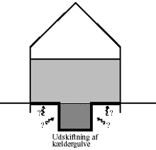 DB-3: Udskiftning af kældergulveFunktion: Ved at etablere en tætning af kældergulvet reduceres indtrængningen af forurenet poreluft til kælderen, hvilket bevirker at forureningspotentialet for spredning gennem kælderloft/ trappeopgang til de overliggende etager reduceres. Tætningen minimerer den konvektive og den diffusive indtrængning gennem kældergulvet, men hindrer ikke at der evt. fortsat sker en forureningsindtrængning gennem kældervæggene. I visse tilfælde kan det derfor være hensigtsmæssigt at foretage en udbedring af eventuelle markante revner i kældervæggene for derved at eliminere oplagte spredningsveje. Metoden med udskiftning af kældergulve anvendes typisk i de tilfælde hvor kældergulvet enten er ubefæstet eller hvor gulvets tilbageholdelsesevne er særdeles ringe, eksempelvis ved meget revnede betongulve, trægulve, pigstensbelægninger eller tilsvarende. Metoden anvendes typisk i ældre ejendomme hvor kælderen alene udgør en mindre del af det bebyggede areal og hvor gulvene i den øvrige del af ejendommen vurderes at være relativt tætte. Metoden kan anvendes som en permanent særskilt afværge overfor ejendomme, der er påvirket i moderat grad og uden udeluftpåvirkning. Ved metoden foregår ingen kildefjernelse. Anlægsbeskrivelse: Den eksisterende belægning fjernes (beton, træ, pigsten osv.). Indgrebet udføres under hensyntagen til bygningens stabilitetsmæssige forhold og i visse tilfælde kan det være nødvendigt at foretage udstøbning ovenpå det eksisterende gulv. I ældre ejendomme må de funderingsmæssige forhold i nogle tilfælde forventes at være uegnede for indbygning af gulvkonstruktioner med en tykkelse over 10- 15 cm, såfremt den eksisterende frihøjde i kælderrummet skal bibeholdes. Foranstaltningen vil som regel i højere grad have karakter af at være en udbedring/ renoveringen af de eksisterende forhold end at være en "ombygning" (etablering af nyt gulv). Som en del af arbejdet foretages evt. en udskiftning af jorden under gulvet til gruspude (ca. 15 - 25 cm kapillarbrydende grus der komprimeres). Der udstøbes typisk 10-15 cm armeret betonplade (B25M, moderat miljøklasse). Ovenpå betonpladen afsluttes evt. med 2 cm slidlag, alternativt færdigglittes betonpladen. Langs alle kanter ilægges ca. 10 mm kantafgrænsning (som f.eks. lodretstående polystyrol). Betonpladen skal afdækkes for at undgå for tidlig udtørring med risiko for svindrevner. Efter en passende afhærdningsperiode på typisk 4 -8 dage ilægges langs alle kanter en diffusionstæt fuge. Som alternativ kan anvendes et ekspanderende fugebånd (diffusionstæt type). Dersom det eksisterende kældergulv har indbygget isolering suppleres gulvopbygningen evt. med udlægning af støbebatts (10-20 cm) under betonpladen. Tætheden i gulvet kan øges ved at foretage indbygning af en diffusionstæt membran (eks. RAC membran) under betonpladen. Eller alternativt ved afslutningsvist at male gulvet med en diffusionstæt maling. For en nærmere beskrivelse vedrørende "maling af kældergulve" henvises til datablad DB2. Ved indbygning af diffusionstæt membran er det vigtigt at leverandørens lægningsforskrifter nøje overholdes, herunder procedure for sammensvejsninger, rette overlæg længder og monteringsvejledning langs lodrette flader (vægge, rørgennemføringer osv.). Samlinger og afslutninger langs lodrette flader er et meget sårbart punkt ved teknikken og fejlagtig montage kan resulterer i at effekten tilnærmelsesvis udebliver. Ofte fravælges indbygning af membran da spredning gennem kældervægge fortsat kan være en risiko og da anlægsudgifterne samtidig øges væsentligt. For nærmere beskrivelse af anvendelse af membran henvises til datablad DB1. Som supplement til renoveringen af kældergulvet foretages evt. en simpel tætning af revner og lignende i kældervæggene. Tætning udføres typisk ved indledningsvist at fjerne løsthængende puds og lign. Efterfølgende injiceres revnerne eksempelvis via skrå hulboringer ind til revnen. Injiceringen foretages med fugemasse gennem hullerne indtil revnen er udfyldt. Alternativt udføres revnetætningen under højt tryk med specialtætnende fugemasse. Effekt: Afværgen har effekt umiddelbart efter anlægsarbejdet er afsluttet. En tætning af gulvkonstruktionen vil ofte bevirke at der sker en væsentlig opkoncentrering af forureningsdampe under gulvet. Det er derfor vigtigt at der er foretaget en vurdering af risikoen for den diffusive og konventive spredning gennem kældervæggene. Effekten af tiltaget afhænger i høj grad af dette forhold. Der vurderes at kunne opnås reduktioner i indeklimapåvirkningen på 20-80 %.