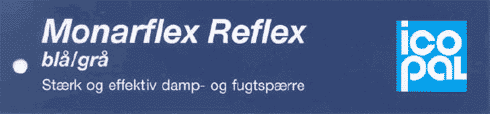 Samlingsdetaljer Vigtigt: Monarflex reflex anvendes som damp- og fugtspærre i konstruktioner med store krav til effektiv sikring mod damp- og fugtvandring. En effektiv damp- og fugtspærre kræver stor omhyggelighed ved alle gennembrydninger og samlinger. Tilbehør: Monarfol Tape: Metalliseret Monarfol Forsegler: Monarfol Rørkrave: 100 x 100, 100 x 150, 150 x 150 mm. samt uden udstandsning. Specialmål op til Ø 500